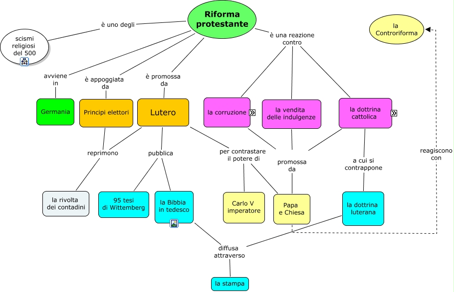 Questa Cmap, creata con IHMC CmapTools, contiene informazioni relative a: riformaOK, Riforma protestante è uno degli scismi religiosi del 500, Riforma protestante avviene in Germania, la vendita delle indulgenze promossa da Papa e Chiesa, Papa e Chiesa reagiscono con la Controriforma, la corruzione promossa da Papa e Chiesa, Principi elettori reprimono la rivolta dei contadini, la dottrina luterana diffusa attraverso la stampa, Lutero per contrastare il potere di Carlo V imperatore, la dottrina cattolica a cui si contrappone la dottrina luterana, Riforma protestante è una reazione contro la dottrina cattolica, Riforma protestante è promossa da Lutero, Lutero pubblica la Bibbia in tedesco, Riforma protestante è una reazione contro la corruzione, Lutero per contrastare il potere di Papa e Chiesa, la Bibbia in tedesco diffusa attraverso la stampa, la dottrina cattolica promossa da Papa e Chiesa, Lutero reprimono la rivolta dei contadini, Lutero pubblica 95 tesi di Wittemberg, Riforma protestante è appoggiata da Principi elettori, Riforma protestante è una reazione contro la vendita delle indulgenze