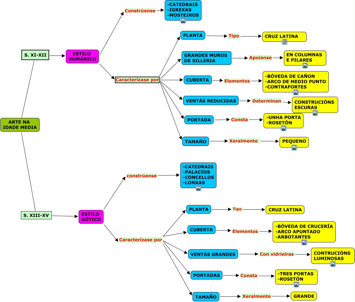 Este Cmap, tiene información relacionada con: ARTE IDADE MEDIA, PLANTA Tipo CRUZ LATINA, TAMAÑO Xeralmente PEQUENO, ESTILO ROMÁNICO Caracterízase por GRANDES MUROS DE SILLERIA, ESTILO ROMÁNICO Caracterízase por VENTÁS REDUCIDAS, GRANDES MUROS DE SILLERIA Apoianse EN COLUMNAS E PILARES, CUBERTA Elementos -BÓVEDA DE CAÑON -ARCO DE MEDIO PUNTO -CONTRAFORTES, ESTILO GÓTICO Caracterízase por PORTADAS, ESTILO ROMÁNICO Constrúense -CATEDRAIS -IGREXAS -MOSTEIROS, ESTILO ROMÁNICO Caracterízase por TAMAÑO, ESTILO ROMÁNICO Caracterízase por PLANTA, ESTILO ROMÁNICO Caracterízase por CUBERTA, PORTADAS Consta -TRES PORTAS -ROSETÓN, ESTILO GÓTICO constrúense -CATEDRAIS -PALACIOS -CONCELLOS -LONXAS, ARTE NA IDADE MEDIA S. XIII-XV ESTILO GÓTICO, ESTILO GÓTICO Caracterízase por PLANTA, ESTILO GÓTICO Caracterízase por CUBERTA, VENTÁS REDUCIDAS Determinan CONSTRUCIÓNS ESCURAS, ARTE NA IDADE MEDIA S. XI-XII ESTILO ROMÁNICO, PORTADA Consta -UNHA PORTA -ROSETÓN, ESTILO ROMÁNICO Caracterízase por PORTADA
