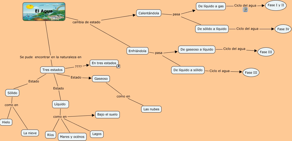 Este Cmap, tiene información relacionada con: El ciclo de agua, Tres estados Estado Líquido, El Agua cambia de estado Calentándola, Gaseoso como en Las nubes, De sólido a líquido Ciclo del agua Fase IV, Tres estados Estado Gaseoso, El Agua cambia de estado Enfriándola, Calentándola pasa De sólido a líquido, Enfriándola pasa De líquido a sólido, Tres estados ???? En tres estados, Líquido como en Bajo el suelo, Tres estados Estado Sólido, Líquido como en Mares y océnos, De líquido a gas Ciclo del agua Fase I y II, De líquido a sólido Ciclo el agua Fase III, Líquido como en Lagos, El Agua Se pude encontrar en la naturaleza en Tres estados, Enfriándola pasa De gaseoso a líquido, Calentándola pasa De líquido a gas, Sólido como en La nieve, Líquido como en Ríos