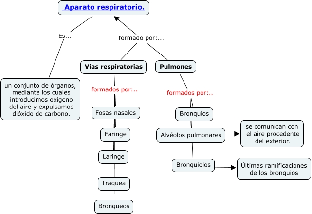 Este Cmap, tiene información relacionada con: Aparato respiratorio, Aparato respiratorio. Es... un conjunto de órganos, mediante los cuales introducimos oxígeno del aire y expulsamos dióxido de carbono., Pulmones formados por:.. Bronquiolos, Alvéolos pulmonares ???? se comunican con el aire procedente del exterior., Vias respiratorias formado por:... Aparato respiratorio., Vias respiratorias formados por:.. Bronqueos, Pulmones formados por:.. Bronquios, Bronquiolos ???? Últimas ramificaciones de los bronquios, Vias respiratorias formados por:.. Laringe, Vias respiratorias formados por:.. Fosas nasales, Pulmones formados por:.. Alvéolos pulmonares, Vias respiratorias formados por:.. Traquea, Vias respiratorias formados por:.. Faringe, Vias respiratorias formado por:... Pulmones