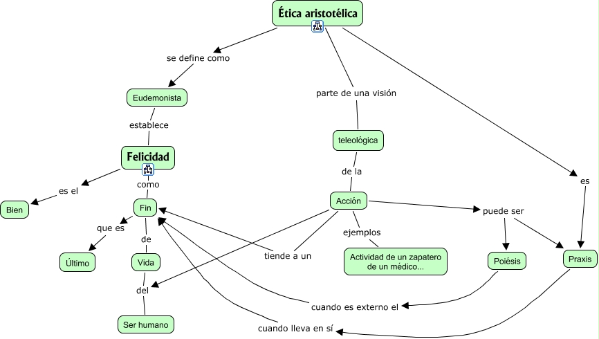 Este Cmap, tiene información relacionada con: Aristoteles_etica_2, Fin de Vida, Ética aristotélica es Praxis, teleológica de la Acción, Felicidad como Fin, Poiésis cuando es externo el Fin, Vida del Ser humano, Felicidad es el Bien, Eudemonista establece Felicidad, Ética aristotélica parte de una visión teleológica, Praxis cuando lleva en sí Fin, Acción tiende a un Fin, Acción ejemplos Actividad de un zapatero de un médico..., Acción puede ser Praxis, Fin que es Último, Acción del Ser humano, Ética aristotélica se define como Eudemonista, Acción puede ser Poiésis