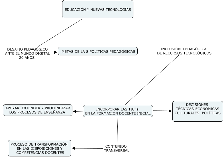 Este Cmap, tiene información relacionada con: CLASE 2, EDUCACIÓN Y NUEVAS TECNOLOGÍAS DESAFIO PEDAGÓGICO ANTE EL MUNDO DIGITAL 20 AÑOS METAS DE LA S POLITICAS PEDAGÓGICAS, INCORPORAR LAS TIC`s EN LA FORMACION DOCENTE INICIAL ???? DECISIONES TÉCNICAS-ECONÓMICAS CULLTURALES -POLÍTICAS, INCORPORAR LAS TIC`s EN LA FORMACION DOCENTE INICIAL ???? APOYAR, EXTENDER Y PROFUNDIZAR LOS PROCESOS DE ENSEÑANZA, METAS DE LA S POLITICAS PEDAGÓGICAS INCLUSIÓN PEDAGÓGICA DE RECURSOS TECNOLÓGICOS INCORPORAR LAS TIC`s EN LA FORMACION DOCENTE INICIAL, INCORPORAR LAS TIC`s EN LA FORMACION DOCENTE INICIAL CONTENIDO TRANSVERSAL PROCESO DE TRANSFORMACIÓN EN LAS DISPOSICIONES Y COMPETENCIAS DOCENTES
