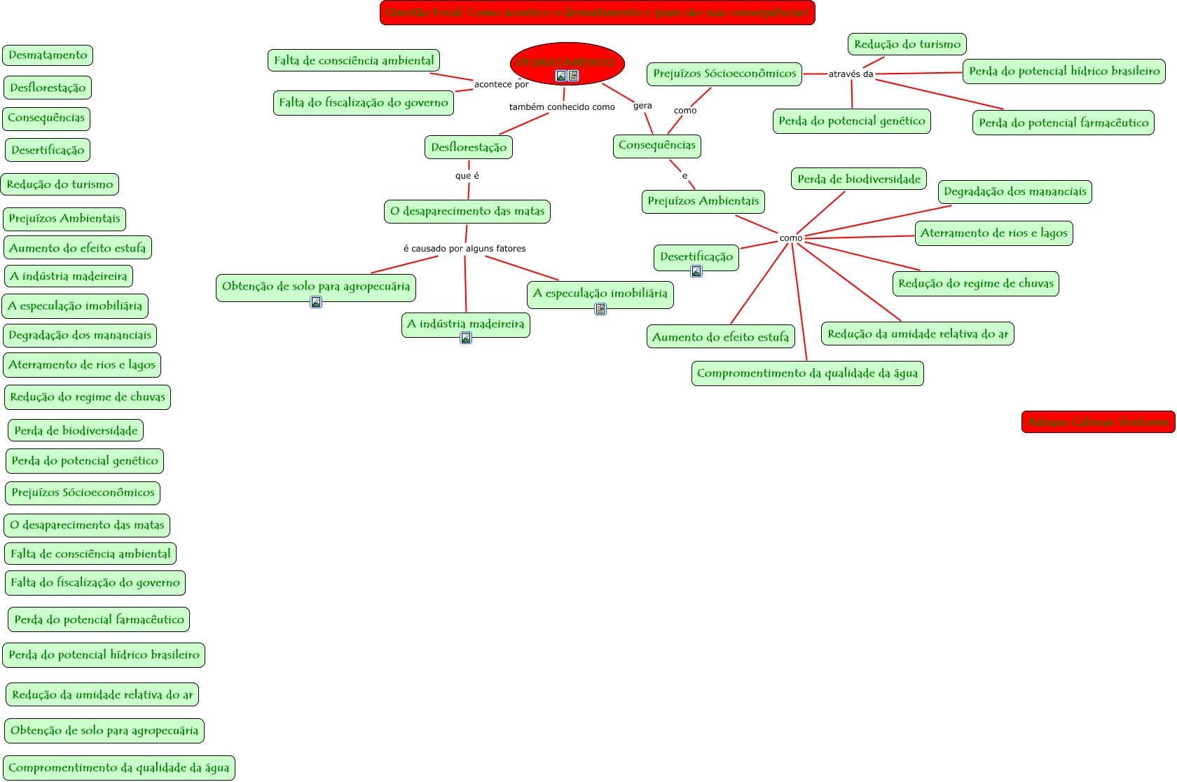 Esse mapa conceitual, produzido no IHMC CmapTools, tem a informação relacionada a: Mapa_Adriane_Caliman_Ventorim, O desaparecimento das matas é causado por alguns fatores A indústria madeireira, Prejuízos Sócioeconômicos através da Perda do potencial farmacêutico, Prejuízos Ambientais como Desertificação, Prejuízos Ambientais como Perda de biodiversidade, DESMATAMENTO acontece por Falta de consciência ambiental, Prejuízos Ambientais como Redução do regime de chuvas, Prejuízos Sócioeconômicos através da Perda do potencial genético, Desflorestação que é O desaparecimento das matas, DESMATAMENTO acontece por Falta do fiscalização do governo, Prejuízos Ambientais como Aterramento de rios e lagos, Prejuízos Ambientais como Aumento do efeito estufa, DESMATAMENTO gera Consequências, O desaparecimento das matas é causado por alguns fatores Obtenção de solo para agropecuária, Prejuízos Ambientais como Degradação dos mananciais, Consequências como Prejuízos Sócioeconômicos, Consequências e Prejuízos Ambientais, DESMATAMENTO também conhecido como Desflorestação, O desaparecimento das matas é causado por alguns fatores A especulação imobiliária, Prejuízos Ambientais como Redução da umidade relativa do ar, Prejuízos Sócioeconômicos através da Perda do potencial hídrico brasileiro