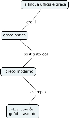 Questa Cmap, creata con IHMC CmapTools, contiene informazioni relative a: grecia lingua, greco antico sostituito dal greco moderno, greco moderno esempio Γνῶθι σεαυτόν, gnôthi seautón, la lingua ufficiale greca era il greco antico
