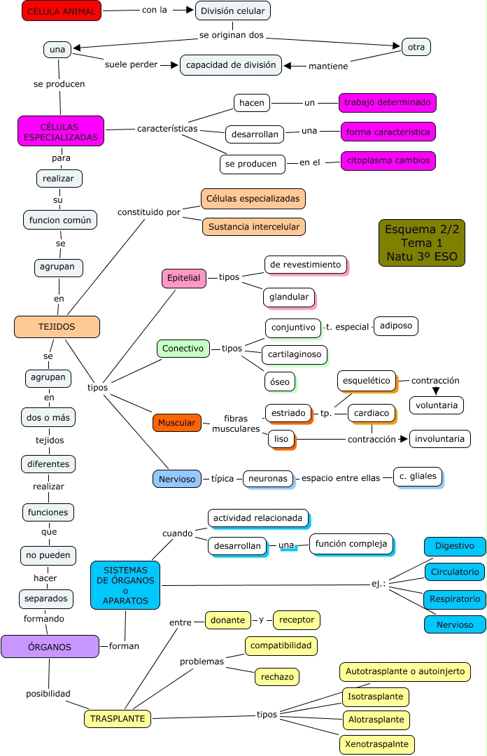 Este Cmap, tiene información relacionada con: Tema 1 2_2 El ser humano como animal pluricelular, TEJIDOS tipos Epitelial, dos o más tejidos diferentes, TRASPLANTE tipos Xenotraspalnte, no pueden hacer separados, División celular se originan dos otra, SISTEMAS DE ÓRGANOS o APARATOS cuando actividad relacionada, estriado tp. cardiaco, realizar su funcion común, TRASPLANTE entre donante, TEJIDOS tipos Conectivo, Muscular fibras musculares estriado, TRASPLANTE problemas compatibilidad, liso contracción involuntaria, Muscular fibras musculares liso, funcion común se agrupan, CÉLULAS ESPECIALIZADAS para realizar, TRASPLANTE tipos Autotrasplante o autoinjerto, SISTEMAS DE ÓRGANOS o APARATOS ej.: Digestivo, Conectivo tipos conjuntivo, SISTEMAS DE ÓRGANOS o APARATOS ej.: Circulatorio