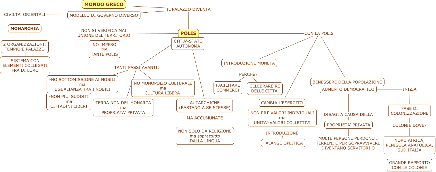 Questa Cmap, creata con IHMC CmapTools, contiene informazioni relative a: Mondo Greco-appunti (Vero Arioli), POLIS CON LA POLIS BENESSERE DELLA POPOLAZIONE, PROPRIETA' PRIVATA MOLTE PERSONE PERDONO I TERRENI E PER SOPRAVVIVERE DIVENTANO SERVITORI O FALANGE OPLITICA, INTRODUZIONE MONETA PERCHè? CELEBRARE RE DELLE CITTA', POLIS TANTI PASSI AVANTI: TERRA NON DEL MONARCA ma PROPRIATA' PRIVATA, AUMENTO DEMOCRAFICO DISAGI A CAUSA DELLA PROPRIETA' PRIVATA, POLIS TANTI PASSI AVANTI: NO MONOPOLIO CULTURALE ma CULTURA LIBERA, AUMENTO DEMOCRAFICO INIZIA FASE DI COLONIZZAZIONE, NON PIU' VALORI INDIVIDUALI ma UNITA'-VALORI COLLETTIVI INTRODUZIONE FALANGE OPLITICA, MONDO GRECO MODELLO DI GOVERNO DIVERSO, INTRODUZIONE MONETA PERCHè? FACILITARE COMMERCI, MODELLO DI GOVERNO DIVERSO IL PALAZZO DIVENTA POLIS, FASE DI COLONIZZAZIONE COLONIE DOVE? NORD AFRICA, PENISOLA ANATOLICA, SUD ITALIA, NORD AFRICA, PENISOLA ANATOLICA, SUD ITALIA GRANDE RAPPORTO CON LE COLONIE, MODELLO DI GOVERNO DIVERSO CIVILTA' ORIENTALI MONARCHIA, POLIS NON SI VERIFICA MAI UNIONE DEL TERRITORIO NO IMPERO MA TANTE POLIS, POLIS AUTARCHICHE (BASTANO A SE STESSE), MONDO GRECO IL PALAZZO DIVENTA POLIS, AUTARCHICHE (BASTANO A SE STESSE) MA ACCUMUNATE NON SOLO DA RELIGIONE ma soprattutto DALLA LINGUA, POLIS CON LA POLIS CAMBIA L'ESERCITO, 2 ORGANIZZAZIONI: TEMPIO E PALAZZO SISTEMA CON ELEMENTI COLLEGATI FRA DI LORO