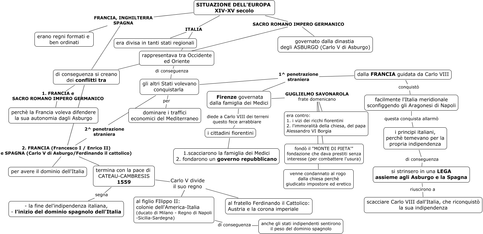 Questa Cmap, creata con IHMC CmapTools, contiene informazioni relative a: 6.Europa XIV-XV secolo, facilmente l'Italia meridionale sconfiggendo gli Aragonesi di Napoli questa conquista allarmò i principi italiani, perchè temevano per la propria indipendenza, Firenze governata dalla famiglia dei Medici GUGLIELMO SAVONAROLA frate domenicano venne condannato al rogo dalla chiesa perchè giudicato impostore ed eretico, i cittadini fiorentini che 1.scacciarono la famiglia dei Medici 2. fondarono un governo repubblicano, gli altri Stati volevano conquistarla 2. FRANCIA (Francesco I / Enrico II) e SPAGNA (Carlo V di Asburgo/Ferdinando il cattolico) per avere il dominio dell'Italia, termina con la pace di CATEAU-CAMBRESIS 1559 segna - la fine del'indipendenza italiana, - l'inizio del dominio spagnolo dell'Italia, termina con la pace di CATEAU-CAMBRESIS 1559 Carlo V divide il suo regno al fratello Ferdinando il Cattolico: Austria e la corona imperiale, SITUAZIONE DELL'EUROPA XIV-XV secolo SACRO ROMANO IMPERO GERMANICO di conseguenza si creano dei conflitti tra, gli altri Stati volevano conquistarla 1^ penetrazione straniera Firenze governata dalla famiglia dei Medici, Firenze governata dalla famiglia dei Medici GUGLIELMO SAVONAROLA frate domenicano era contro: 1. i vizi dei ricchi fiorentini 2. l'immoralità della chiesa, del papa Alessandro VI Borgia, SITUAZIONE DELL'EUROPA XIV-XV secolo FRANCIA, INGHILTERRA SPAGNA di conseguenza si creano dei conflitti tra, Firenze governata dalla famiglia dei Medici diede a Carlo VIII dei terreni questo fece arrabbiare i cittadini fiorentini, gli altri Stati volevano conquistarla per dominare i traffici economici del Mediterraneo, gli altri Stati volevano conquistarla 2. FRANCIA (Francesco I / Enrico II) e SPAGNA (Carlo V di Asburgo/Ferdinando il cattolico) termina con la pace di CATEAU-CAMBRESIS 1559, di conseguenza si creano dei conflitti tra 2. FRANCIA (Francesco I / Enrico II) e SPAGNA (Carlo V di Asburgo/Ferdinando il cattolico) termina con la pace di CATEAU-CAMBRESIS 1559, gli altri Stati volevano conquistarla 1^ penetrazione straniera dalla FRANCIA guidata da Carlo VIII, termina con la pace di CATEAU-CAMBRESIS 1559 Carlo V divide il suo regno al figlio FIlippo II: colonie dell'America-Italia (ducato di Milano - Regno di Napoli -Sicilia-Sardegna), SITUAZIONE DELL'EUROPA XIV-XV secolo FRANCIA, INGHILTERRA SPAGNA erano regni formati e ben ordinati, si strinsero in una LEGA assieme agli Asburgo e la Spagna riuscirono a scacciare Carlo VIII dall'Italia, che riconquistò la sua indipendenza, SITUAZIONE DELL'EUROPA XIV-XV secolo ITALIA rappresentava tra Occidente ed Oriente, di conseguenza si creano dei conflitti tra 2. FRANCIA (Francesco I / Enrico II) e SPAGNA (Carlo V di Asburgo/Ferdinando il cattolico) per avere il dominio dell'Italia