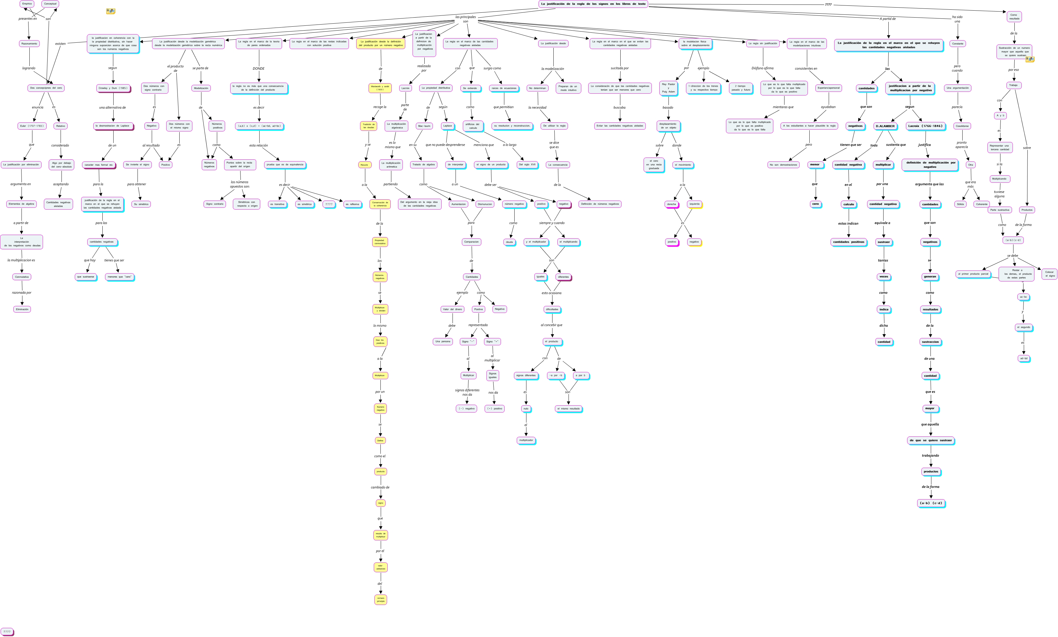 Este Cmap, tiene información relacionada con: mapa, Propiedad conmutativa los Números negativos, Se extiende como artificios del calculo, La justificación de la regla de los signos en los libros de texto las principales son La regla en el marco de las restas indicadas con solución positiva, La regla en el marco en el que se evitan las cantidades negativas aisladas sucitada por La consideracòn de que las cantidades negativas tenian que ser menores que cero, diferentes esto ocasiona dificultades, el movimiento a la izquierda, Se invierte el signo para obtener Su simétrico, Signo "+" al multiplicar Signos iguales, Números positivos como Puntos sobre la recta apartir del origen, Negativo al resultado Se invierte el signo, justificacion a partir de la multiplicacion por negativo segun D.ALAMBER, cantidades negativas tienes que ser menores que "cero", -a por -b son el mismo resultado, Dismunucion para Comparacion, Constante pero cuando Una argumentación, artificios del calculo a lo largo Del siglo XVII, A los estudiantes a hacer plausible la regla pero No son demostraciones, Relativo considerado Algo por debajo del cero-absoluto, prueba que es de equivalencia es decir es transitiva, La justificación desde la modelización gemétrica desde la modelización gemétrica sobre la recta numérica se parte de Modelización