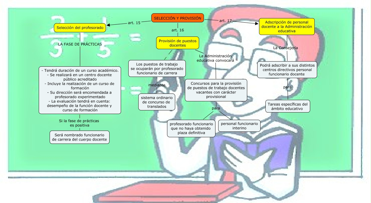 Este Cmap, tiene información relacionada con: SELECCIÓN Y PROVISIÓN, - Tendrá duración de un curso académico. - Se realizará en un centro docente público acreditado - Incluye la realización de un curso de formación - Su dirección será encomendada a profesorado experimentado - La evaluación tendrá en cuenta: desempeño de la función docente y curso de formación Si la fase de prácticas es positiva Será nombrado funcionario de carrera del cuerpo docente, Adscripción de personal docente a la Administración educativa La Consejería Podrá adscribir a sus distintos centros directivos personal funcionario docente, Selección del profesorado LA FASE DE PRÁCTICAS - Tendrá duración de un curso académico. - Se realizará en un centro docente público acreditado - Incluye la realización de un curso de formación - Su dirección será encomendada a profesorado experimentado - La evaluación tendrá en cuenta: desempeño de la función docente y curso de formación, Podrá adscribir a sus distintos centros directivos personal funcionario docente para Tareas específicas del ámbito educativo, Concursos para la provisión de puestos de trabajo docentes vacantes con carácter provisional para profesorado funcionario que no haya obtenido plaza definitiva, SELECCIÓN Y PROVISIÓN art. 15 Selección del profesorado, Los puestos de trabajo se ocuparán por profesorado funcionario de carrera mediante sistema ordinario de concurso de translados, Provisión de puestos docentes La Administración educativa convocará Concursos para la provisión de puestos de trabajo docentes vacantes con carácter provisional, Provisión de puestos docentes Los puestos de trabajo se ocuparán por profesorado funcionario de carrera, SELECCIÓN Y PROVISIÓN art. 17 Adscripción de personal docente a la Administración educativa, Concursos para la provisión de puestos de trabajo docentes vacantes con carácter provisional para personal funcionario interino, SELECCIÓN Y PROVISIÓN art. 16 Provisión de puestos docentes