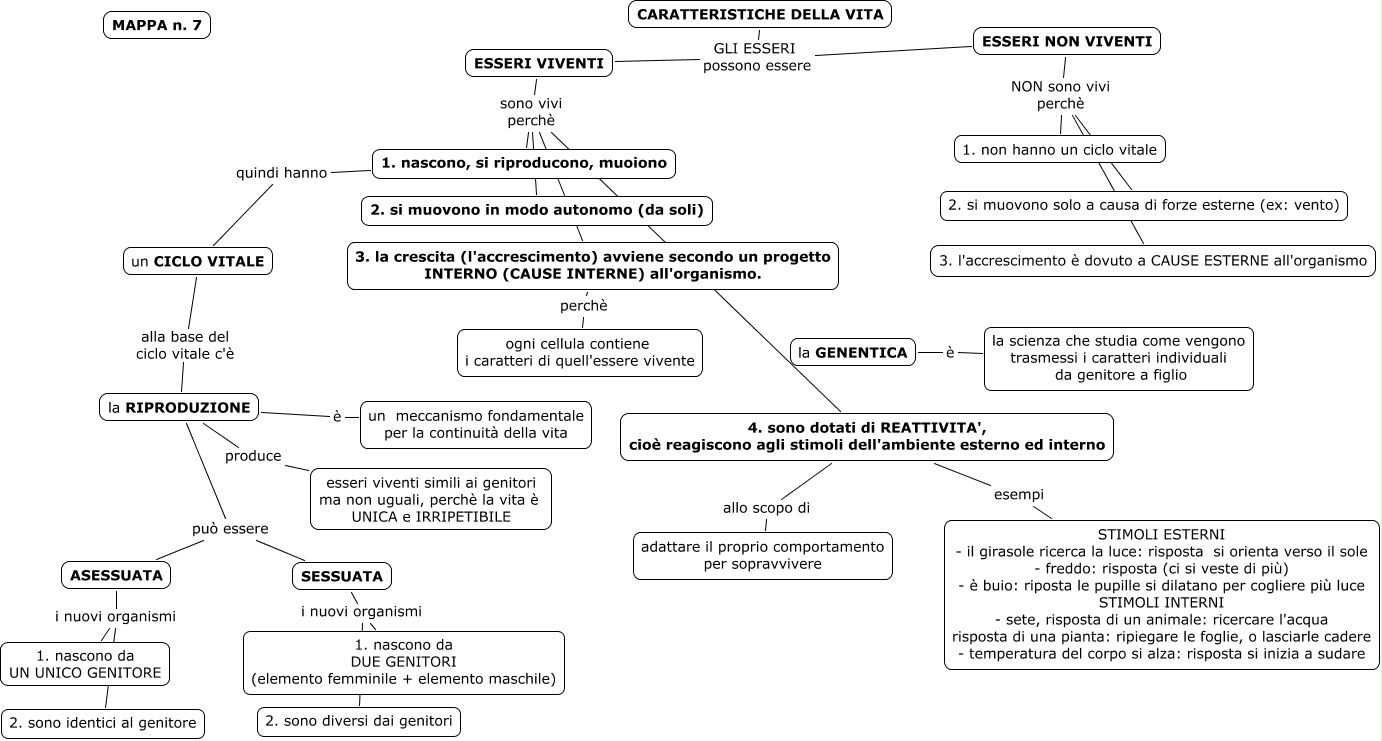 Questa Cmap, creata con IHMC CmapTools, contiene informazioni relative a: 7.esseri viventi, 4. sono dotati di REATTIVITA', cioè reagiscono agli stimoli dell'ambiente esterno ed interno allo scopo di adattare il proprio comportamento per sopravvivere, un CICLO VITALE alla base del ciclo vitale c'è la RIPRODUZIONE, la RIPRODUZIONE produce esseri viventi simili ai genitori ma non uguali, perchè la vita è UNICA e IRRIPETIBILE, 4. sono dotati di REATTIVITA', cioè reagiscono agli stimoli dell'ambiente esterno ed interno esempi STIMOLI ESTERNI - il girasole ricerca la luce: risposta si orienta verso il sole - freddo: risposta (ci si veste di più) - è buio: riposta le pupille si dilatano per cogliere più luce STIMOLI INTERNI - sete, risposta di un animale: ricercare l'acqua risposta di una pianta: ripiegare le foglie, o lasciarle cadere - temperatura del corpo si alza: risposta si inizia a sudare, la GENENTICA è la scienza che studia come vengono trasmessi i caratteri individuali da genitore a figlio, ESSERI VIVENTI sono vivi perchè 2. si muovono in modo autonomo (da soli), ESSERI NON VIVENTI NON sono vivi perchè 3. l'accrescimento è dovuto a CAUSE ESTERNE all'organismo, ASESSUATA i nuovi organismi 1. nascono da UN UNICO GENITORE, ESSERI NON VIVENTI NON sono vivi perchè 2. si muovono solo a causa di forze esterne (ex: vento), la RIPRODUZIONE può essere ASESSUATA, ESSERI NON VIVENTI NON sono vivi perchè 1. non hanno un ciclo vitale, CARATTERISTICHE DELLA VITA GLI ESSERI possono essere ESSERI VIVENTI, 3. la crescita (l'accrescimento) avviene secondo un progetto INTERNO (CAUSE INTERNE) all'organismo. perchè ogni cellula contiene i caratteri di quell'essere vivente, ESSERI VIVENTI sono vivi perchè 1. nascono, si riproducono, muoiono, SESSUATA i nuovi organismi 2. sono diversi dai genitori, ASESSUATA i nuovi organismi 2. sono identici al genitore, la RIPRODUZIONE è un meccanismo fondamentale per la continuità della vita, ESSERI VIVENTI sono vivi perchè 3. la crescita (l'accrescimento) avviene secondo un progetto INTERNO (CAUSE INTERNE) all'organismo., ESSERI VIVENTI sono vivi perchè 4. sono dotati di REATTIVITA', cioè reagiscono agli stimoli dell'ambiente esterno ed interno, 1. nascono, si riproducono, muoiono quindi hanno un CICLO VITALE