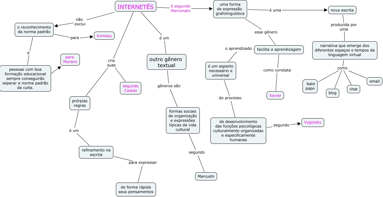 Esse mapa conceitual, produzido no IHMC CmapTools, tem a informação relacionada a: INTERNETÊS (REVISÃO LITERÁRIA).cmap, nova escrita produzida por uma narrativa que emerge dos diferentes espaços e tempos da linguagem virtual, é um aspecto necessário e universal do processo de desenvolvimento das funções psicológicas culturalmente organizadas e especificamente humanas, narrativa que emerge dos diferentes espaços e tempos da linguagem virtual como bate papo, narrativa que emerge dos diferentes espaços e tempos da linguagem virtual como chat, uma forma de expressão grafolinguística esse gênero facilita a aprendizagem, o reconhecimento da norma padrão para Komesu, prórpias regras é um refinamento na escrita, INTERNETÊS cria suas prórpias regras, facilita a aprendizagem como constata Xavier, INTERNETÊS é um outro gênero textual, de desenvolvimento das funções psicológicas culturalmente organizadas e especificamente humanas segundo Vygotsky, facilita a aprendizagem o aprendizado é um aspecto necessário e universal, o reconhecimento da norma padrão e pessoas com boa formação educacional sempre conseguirão separar a norma padrão da culta., pessoas com boa formação educacional sempre conseguirão separar a norma padrão da culta. ???? para Murano, narrativa que emerge dos diferentes espaços e tempos da linguagem virtual como blog, INTERNETÊS não exclui o reconhecimento da norma padrão, uma forma de expressão grafolinguística é uma nova escrita, outro gênero textual gêneros são formas sociais de organização e expressões típicas da vida cultural, INTERNETÊS cria suas segundo Caiado, refinamento na escrita para expressar de forma rápida seus pensamentos