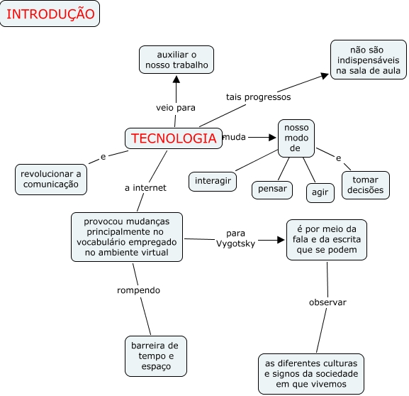 Esse mapa conceitual, produzido no IHMC CmapTools, tem a informação relacionada a: INTRODUÇÃO.cmap, provocou mudanças principalmente no vocabulário empregado no ambiente virtual para Vygotsky é por meio da fala e da escrita que se podem, é por meio da fala e da escrita que se podem observar as diferentes culturas e signos da sociedade em que vivemos, TECNOLOGIA veio para auxiliar o nosso trabalho, provocou mudanças principalmente no vocabulário empregado no ambiente virtual rompendo barreira de tempo e espaço, nosso modo de ???? pensar, TECNOLOGIA e revolucionar a comunicação, nosso modo de ???? interagir, TECNOLOGIA muda nosso modo de, TECNOLOGIA tais progressos não são indispensáveis na sala de aula, nosso modo de e tomar decisões, TECNOLOGIA a internet provocou mudanças principalmente no vocabulário empregado no ambiente virtual, nosso modo de ???? agir