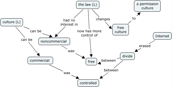 This Concept Map, created with IHMC CmapTools, has information related to: Piracy, the law (L) had no interest in noncommercial, the law (L) now has more control of free, the law (L) changes free culture, divide between controlled, divide between free, culture (L) can be noncommercial, Internet erased divide, noncommercial was free, commercial was controlled, free culture to a permission culture, culture (L) can be commercial