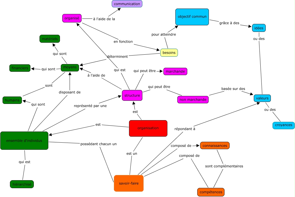 Cette carte de concepts créée avec IHMC CmapTools traite de: carte organisation, connaissances sont complémentaires compétences, ensemble d'individus possédant chacun un savoir-faire, ensemble d'individus représenté par une structure, ensemble d'individus qui est hiérarchisé, structure qui est organisé, non marchande basée sur des valeurs, organisé à l'aide de la communication, moyens qui sont matériels, structure qui peut être marchande, besoins pour atteindre objectif commun, savoir-faire composé de connaissances, organisation est ensemble d'individus, moyens qui sont financiers, idées ou des valeurs, organisation est un savoir-faire, savoir-faire composé de compétences, structure à l'aide de moyens, besoins déterminent moyens, valeurs ou des croyances, moyens sont humains