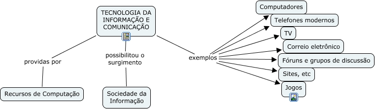 Esse mapa conceitual, produzido no IHMC CmapTools, tem a informação relacionada a: Tecnologia da Informação e Comunicação, TECNOLOGIA DA INFORMAÇÃO E COMUNICAÇÃO exemplos Sites, etc, TECNOLOGIA DA INFORMAÇÃO E COMUNICAÇÃO exemplos TV, TECNOLOGIA DA INFORMAÇÃO E COMUNICAÇÃO exemplos Fóruns e grupos de discussão, TECNOLOGIA DA INFORMAÇÃO E COMUNICAÇÃO possibilitou o surgimento Sociedade da Informação, TECNOLOGIA DA INFORMAÇÃO E COMUNICAÇÃO exemplos Computadores, TECNOLOGIA DA INFORMAÇÃO E COMUNICAÇÃO exemplos Telefones modernos, TECNOLOGIA DA INFORMAÇÃO E COMUNICAÇÃO providas por Recursos de Computação, TECNOLOGIA DA INFORMAÇÃO E COMUNICAÇÃO exemplos Correio eletrônico, TECNOLOGIA DA INFORMAÇÃO E COMUNICAÇÃO exemplos Jogos