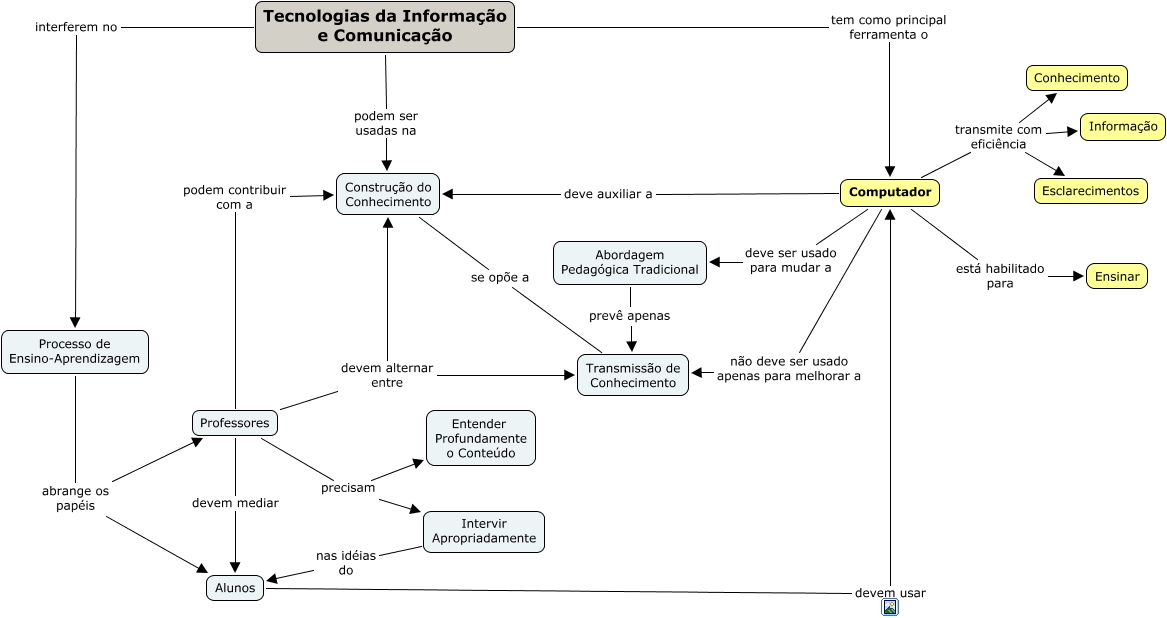 Esse mapa conceitual, produzido no IHMC CmapTools, tem a informação relacionada a: TICS_Construcao_Conhecimento, Computador deve auxiliar a Construção do Conhecimento, Processo de Ensino-Aprendizagem abrange os papéis Alunos, Computador transmite com eficiência Conhecimento, Professores precisam Intervir Apropriadamente, Abordagem Pedagógica Tradicional prevê apenas Transmissão de Conhecimento, Intervir Apropriadamente nas idéias do Alunos, Professores podem contribuir com a Construção do Conhecimento, Processo de Ensino-Aprendizagem abrange os papéis Professores, Professores precisam Entender Profundamente o Conteúdo, Professores devem alternar entre Construção do Conhecimento, Alunos devem usar Computador, Computador deve ser usado para mudar a Abordagem Pedagógica Tradicional, Professores devem mediar Alunos, Computador transmite com eficiência Esclarecimentos, Computador não deve ser usado apenas para melhorar a Transmissão de Conhecimento, Professores devem alternar entre Transmissão de Conhecimento, Tecnologias da Informação e Comunicação podem ser usadas na Construção do Conhecimento, Computador está habilitado para Ensinar, Tecnologias da Informação e Comunicação interferem no Processo de Ensino-Aprendizagem, Computador transmite com eficiência Informação