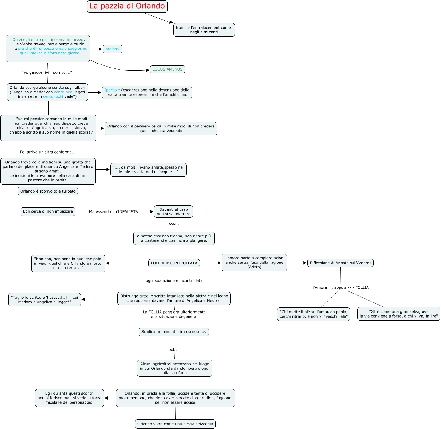 Questa Cmap, creata con IHMC CmapTools, contiene informazioni relative a: La pazzia di Orlando- Benaglia Andrea, Orlando trova delle incisioni su una grotta che parlano del piacere di quando Angelica e Medoro si sono amati. Le incisioni le trova pure nella casa di un pastore che lo ospita. ???? "..., da molti invano amata,spesso ne le mie braccia nuda giacque:...", Orlando trova delle incisioni su una grotta che parlano del piacere di quando Angelica e Medoro si sono amati. Le incisioni le trova pure nella casa di un pastore che lo ospita. ???? Orlando è sconvolto e turbato, Orlando è sconvolto e turbato ???? Egli cerca di non impazzire, Orlando, in preda alla follia, uccide e tenta di uccidere molte persone, che dopo aver cercato di aggredirlo, fuggono per non essere uccise. ???? Egli durante questi scontri non si ferisce mai: si vede la forza micidaile del personaggio., Orlando scorge alcune scritte sugli alberi ("Angelica e Medor con cento nodi legati insieme, e in cento lochi vede") ???? Iperbole (esagerazione nella descrizione della realtà tramite espressioni che l'amplifichino, "Quivi egli entrò per riposarvi in mezzo; e v'ebbe travaglioso albergo e crudo, e più che dir si possa empio soggiorno, quell'infelice e sfortunato giorno." "Volgendosi ivi intorno, ..." Orlando scorge alcune scritte sugli alberi ("Angelica e Medor con cento nodi legati insieme, e in cento lochi vede"), Distrugge tutte le scritte intagliate nella pietra e nel legno che rappresentavano l'amore di Angelica e Medoro. "Tagliò lo scritto e 'l sasso,[..] in cui Medoro e Angelica si legge!", Egli cerca di non impazzire Ma essendo un'IDEALISTA Davanti al caso non si sa adattare, FOLLIA INCONTROLLATA ogni sua azione è incontrollata Distrugge tutte le scritte intagliate nella pietra e nel legno che rappresentavano l'amore di Angelica e Medoro., "Va col pensier cercando in mille modi non creder quel ch'al suo dispetto crede: ch'altra Angelica sia, creder si sforza, ch'abbia scritto il suo nome in quella scorza." Poi arriva un'altra conferma... Orlando trova delle incisioni su una grotta che parlano del piacere di quando Angelica e Medoro si sono amati. Le incisioni le trova pure nella casa di un pastore che lo ospita., Riflessione di Ariosto sull'Amore: l'Amore= trappola --> FOLLIA "Chi mette il piè su l'amorosa pania, cerchi ritrarlo, e non v'inveschi l'ale", Sradica un pino al primo scossone. poi.. Alcuni agricoltori accorrono nel luogo in cui Orlando sta dando libero sfogo alla sua furia, FOLLIA INCONTROLLATA "Non son, non sono io quel che paio in viso: quel ch'era Orlando è morto et è sotterra;...", Davanti al caso non si sa adattare così.. la pazzia essendo troppa, non riesce più a contenersi e comincia a piangere., "Va col pensier cercando in mille modi non creder quel ch'al suo dispetto crede: ch'altra Angelica sia, creder si sforza, ch'abbia scritto il suo nome in quella scorza." ???? Orlando con il pensiero cerca in mille modi di non credere quello che sta vedendo, la pazzia essendo troppa, non riesce più a contenersi e comincia a piangere. ???? FOLLIA INCONTROLLATA, "Quivi egli entrò per riposarvi in mezzo; e v'ebbe travaglioso albergo e crudo, e più che dir si possa empio soggiorno, quell'infelice e sfortunato giorno." ???? LOCUS AMENUS, Orlando, in preda alla follia, uccide e tenta di uccidere molte persone, che dopo aver cercato di aggredirlo, fuggono per non essere uccise. ???? Orlando vivrà come una bestia selvaggia, Riflessione di Ariosto sull'Amore: l'Amore= trappola --> FOLLIA "Gli è come una gran selva, ove la via conviene a forza, a chi vi va, fallire", Alcuni agricoltori accorrono nel luogo in cui Orlando sta dando libero sfogo alla sua furia Orlando, in preda alla follia, uccide e tenta di uccidere molte persone, che dopo aver cercato di aggredirlo, fuggono per non essere uccise.