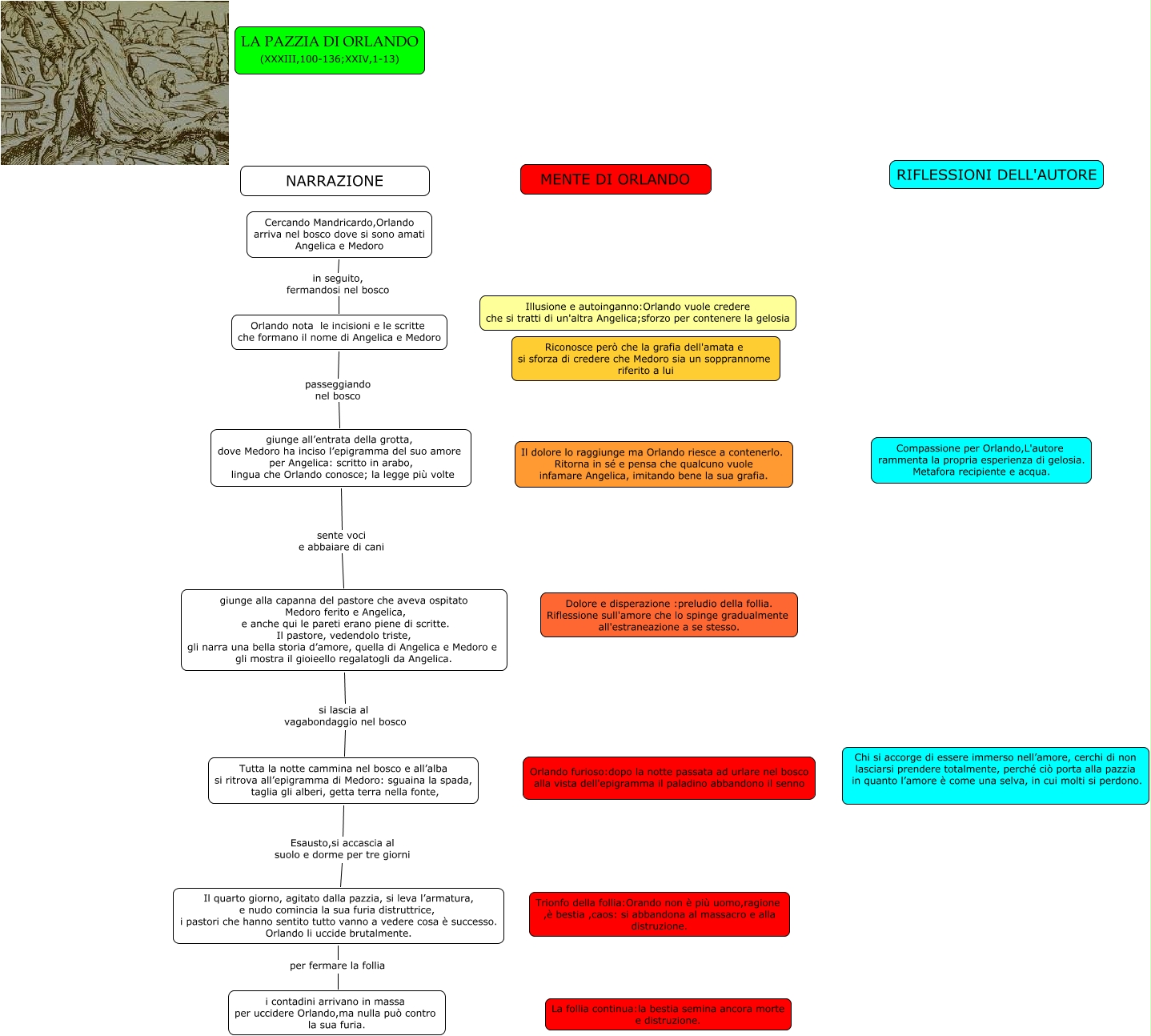 Questa Cmap, creata con IHMC CmapTools, contiene informazioni relative a: Orlando furioso-Amigoni, Tutta la notte cammina nel bosco e all’alba si ritrova all’epigramma di Medoro: sguaina la spada, taglia gli alberi, getta terra nella fonte, Esausto,si accascia al suolo e dorme per tre giorni Il quarto giorno, agitato dalla pazzia, si leva l’armatura, e nudo comincia la sua furia distruttrice, i pastori che hanno sentito tutto vanno a vedere cosa è successo. Orlando li uccide brutalmente., Orlando nota le incisioni e le scritte che formano il nome di Angelica e Medoro passeggiando nel bosco giunge all’entrata della grotta, dove Medoro ha inciso l’epigramma del suo amore per Angelica: scritto in arabo, lingua che Orlando conosce; la legge più volte, Cercando Mandricardo,Orlando arriva nel bosco dove si sono amati Angelica e Medoro in seguito, fermandosi nel bosco Orlando nota le incisioni e le scritte che formano il nome di Angelica e Medoro, Il quarto giorno, agitato dalla pazzia, si leva l’armatura, e nudo comincia la sua furia distruttrice, i pastori che hanno sentito tutto vanno a vedere cosa è successo. Orlando li uccide brutalmente. per fermare la follia i contadini arrivano in massa per uccidere Orlando,ma nulla può contro la sua furia., giunge alla capanna del pastore che aveva ospitato Medoro ferito e Angelica, e anche qui le pareti erano piene di scritte. Il pastore, vedendolo triste, gli narra una bella storia d’amore, quella di Angelica e Medoro e gli mostra il gioieello regalatogli da Angelica. si lascia al vagabondaggio nel bosco Tutta la notte cammina nel bosco e all’alba si ritrova all’epigramma di Medoro: sguaina la spada, taglia gli alberi, getta terra nella fonte,, giunge all’entrata della grotta, dove Medoro ha inciso l’epigramma del suo amore per Angelica: scritto in arabo, lingua che Orlando conosce; la legge più volte sente voci e abbaiare di cani giunge alla capanna del pastore che aveva ospitato Medoro ferito e Angelica, e anche qui le pareti erano piene di scritte. Il pastore, vedendolo triste, gli narra una bella storia d’amore, quella di Angelica e Medoro e gli mostra il gioieello regalatogli da Angelica.