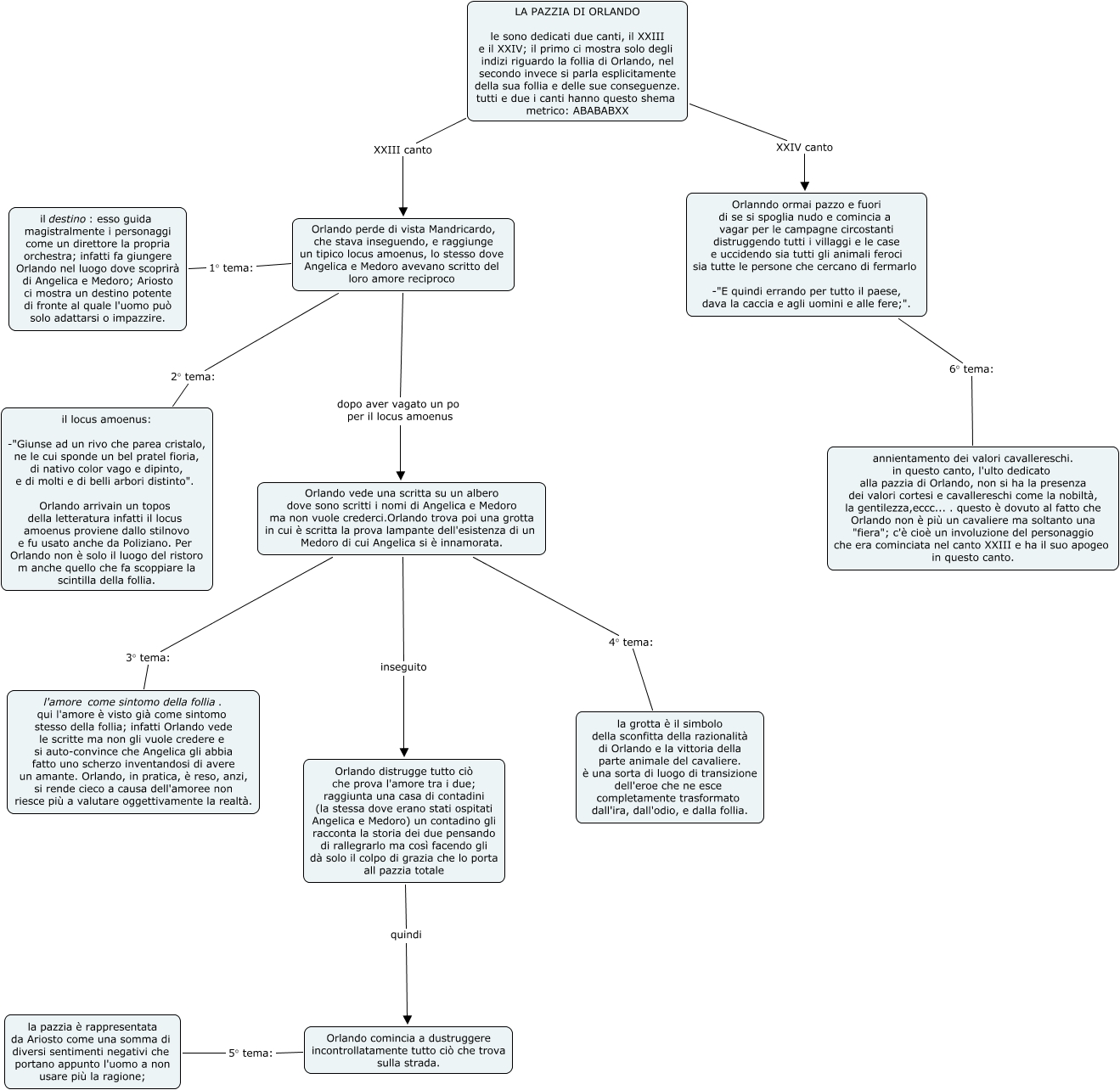 Questa Cmap, creata con IHMC CmapTools, contiene informazioni relative a: La pazzia di Orlando- Francesco Ferrari, Orlando perde di vista Mandricardo, che stava inseguendo, e raggiunge un tipico locus amoenus, lo stesso dove Angelica e Medoro avevano scritto del loro amore reciproco 1° tema: il destino: esso guida magistralmente i personaggi come un direttore la propria orchestra; infatti fa giungere Orlando nel luogo dove scoprirà di Angelica e Medoro; Ariosto ci mostra un destino potente di fronte al quale l'uomo può solo adattarsi o impazzire., LA PAZZIA DI ORLANDO le sono dedicati due canti, il XXIII e il XXIV; il primo ci mostra solo degli indizi riguardo la follia di Orlando, nel secondo invece si parla esplicitamente della sua follia e delle sue conseguenze. tutti e due i canti hanno questo shema metrico: ABABABXX XXIII canto Orlando perde di vista Mandricardo, che stava inseguendo, e raggiunge un tipico locus amoenus, lo stesso dove Angelica e Medoro avevano scritto del loro amore reciproco, Orlando vede una scritta su un albero dove sono scritti i nomi di Angelica e Medoro ma non vuole crederci.Orlando trova poi una grotta in cui è scritta la prova lampante dell'esistenza di un Medoro di cui Angelica si è innamorata. 4° tema: la grotta è il simbolo della sconfitta della razionalità di Orlando e la vittoria della parte animale del cavaliere. è una sorta di luogo di transizione dell'eroe che ne esce completamente trasformato dall'ira, dall'odio, e dalla follia., Orlando perde di vista Mandricardo, che stava inseguendo, e raggiunge un tipico locus amoenus, lo stesso dove Angelica e Medoro avevano scritto del loro amore reciproco dopo aver vagato un po per il locus amoenus Orlando vede una scritta su un albero dove sono scritti i nomi di Angelica e Medoro ma non vuole crederci.Orlando trova poi una grotta in cui è scritta la prova lampante dell'esistenza di un Medoro di cui Angelica si è innamorata., Orlando distrugge tutto ciò che prova l'amore tra i due; raggiunta una casa di contadini (la stessa dove erano stati ospitati Angelica e Medoro) un contadino gli racconta la storia dei due pensando di rallegrarlo ma così facendo gli dà solo il colpo di grazia che lo porta all pazzia totale quindi Orlando comincia a dustruggere incontrollatamente tutto ciò che trova sulla strada., Orlando perde di vista Mandricardo, che stava inseguendo, e raggiunge un tipico locus amoenus, lo stesso dove Angelica e Medoro avevano scritto del loro amore reciproco 2° tema: il locus amoenus: -"Giunse ad un rivo che parea cristalo, ne le cui sponde un bel pratel fioria, di nativo color vago e dipinto, e di molti e di belli arbori distinto". Orlando arrivain un topos della letteratura infatti il locus amoenus proviene dallo stilnovo e fu usato anche da Poliziano. Per Orlando non è solo il luogo del ristoro m anche quello che fa scoppiare la scintilla della follia., Orlando vede una scritta su un albero dove sono scritti i nomi di Angelica e Medoro ma non vuole crederci.Orlando trova poi una grotta in cui è scritta la prova lampante dell'esistenza di un Medoro di cui Angelica si è innamorata. 3° tema: l'amore come sintomo della follia. qui l'amore è visto già come sintomo stesso della follia; infatti Orlando vede le scritte ma non gli vuole credere e si auto-convince che Angelica gli abbia fatto uno scherzo inventandosi di avere un amante. Orlando, in pratica, è reso, anzi, si rende cieco a causa dell'amoree non riesce più a valutare oggettivamente la realtà., Orlando comincia a dustruggere incontrollatamente tutto ciò che trova sulla strada. 5° tema: la pazzia è rappresentata da Ariosto come una somma di diversi sentimenti negativi che portano appunto l'uomo a non usare più la ragione;, Orlanndo ormai pazzo e fuori di se si spoglia nudo e comincia a vagar per le campagne circostanti distruggendo tutti i villaggi e le case e uccidendo sia tutti gli animali feroci sia tutte le persone che cercano di fermarlo -"E quindi errando per tutto il paese, dava la caccia e agli uomini e alle fere;". 6° tema: annientamento dei valori cavallereschi. in questo canto, l'ulto dedicato alla pazzia di Orlando, non si ha la presenza dei valori cortesi e cavallereschi come la nobiltà, la gentilezza,eccc... . questo è dovuto al fatto che Orlando non è più un cavaliere ma soltanto una "fiera"; c'è cioè un involuzione del personaggio che era cominciata nel canto XXIII e ha il suo apogeo in questo canto., LA PAZZIA DI ORLANDO le sono dedicati due canti, il XXIII e il XXIV; il primo ci mostra solo degli indizi riguardo la follia di Orlando, nel secondo invece si parla esplicitamente della sua follia e delle sue conseguenze. tutti e due i canti hanno questo shema metrico: ABABABXX XXIV canto Orlanndo ormai pazzo e fuori di se si spoglia nudo e comincia a vagar per le campagne circostanti distruggendo tutti i villaggi e le case e uccidendo sia tutti gli animali feroci sia tutte le persone che cercano di fermarlo -"E quindi errando per tutto il paese, dava la caccia e agli uomini e alle fere;"., Orlando vede una scritta su un albero dove sono scritti i nomi di Angelica e Medoro ma non vuole crederci.Orlando trova poi una grotta in cui è scritta la prova lampante dell'esistenza di un Medoro di cui Angelica si è innamorata. inseguito Orlando distrugge tutto ciò che prova l'amore tra i due; raggiunta una casa di contadini (la stessa dove erano stati ospitati Angelica e Medoro) un contadino gli racconta la storia dei due pensando di rallegrarlo ma così facendo gli dà solo il colpo di grazia che lo porta all pazzia totale