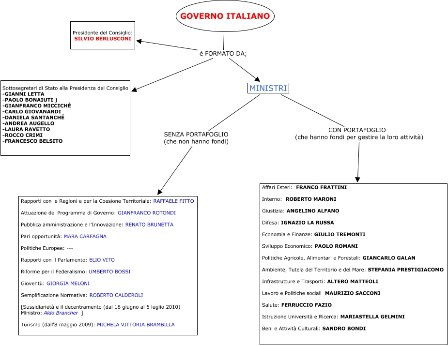 Questa Cmap, creata con IHMC CmapTools, contiene informazioni relative a: il governo italiano (Lucia Scolari), MINISTRI SENZA PORTAFOGLIO (che non hanno fondi) Rapporti con le Regioni e per la Coesione Territoriale: RAFFAELE FITTO Attuazione del Programma di Governo: GIANFRANCO ROTONDI Pubblica amministrazione e l'Innovazione: RENATO BRUNETTA Pari opportunità: MARA CARFAGNA Politiche Europee: --- Rapporti con il Parlamento: ELIO VITO Riforme per il Federalismo: UMBERTO BOSSI Gioventù: GIORGIA MELONI Semplificazione Normativa: ROBERTO CALDEROLI [Sussidiarietà e il decentramento (dal 18 giugno al 6 luglio 2010) Ministro: Aldo Brancher ] Turismo (dall'8 maggio 2009): MICHELA VITTORIA BRAMBILLA, GOVERNO ITALIANO è FORMATO DA; Sottosegretari di Stato alla Presidenza del Consiglio -GIANNI LETTA -PAOLO BONAIUTI ) -GIANFRANCO MICCICHÈ -CARLO GIOVANARDI -DANIELA SANTANCHÉ -ANDREA AUGELLO -LAURA RAVETTO -ROCCO CRIMI -FRANCESCO BELSITO, GOVERNO ITALIANO è FORMATO DA; Presidente del Consiglio: SILVIO BERLUSCONI, MINISTRI CON PORTAFOGLIO (che hanno fondi per gestire la loro attività) Affari Esteri: FRANCO FRATTINI Interno: ROBERTO MARONI Giustizia: ANGELINO ALFANO Difesa: IGNAZIO LA RUSSA Economia e Finanze: GIULIO TREMONTI Sviluppo Economico: PAOLO ROMANI Politiche Agricole, Alimentari e Forestali: GIANCARLO GALAN Ambiente, Tutela del Territorio e del Mare: STEFANIA PRESTIGIACOMO Infrastrutture e Trasporti: ALTERO MATTEOLI Lavoro e Politiche sociali MAURIZIO SACCONI Salute: FERRUCCIO FAZIO Istruzione Università e Ricerca: MARIASTELLA GELMINI Beni e Attività Culturali: SANDRO BONDI, GOVERNO ITALIANO è FORMATO DA; MINISTRI