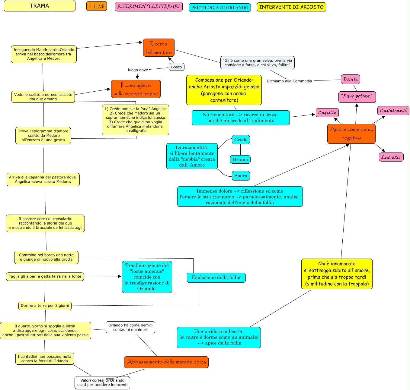 Questa Cmap, creata con IHMC CmapTools, contiene informazioni relative a: Carminati - La pazzia di Orlando, Dante Richiamo alla Commedia "Gli è come una gran selva, ove la via conviene a forza, a chi vi va, fallire", Inseguendo Mandricardo,Orlando arriva nel bosco dell'amore fra Angelica e Medoro ???? Ricerca fellimentare, Cammina nel bosco una notte e giunge di nuovo alla grotta Esplosione della follia, Amore come pena, negativo ???? Lucrezio, Ricerca fellimentare "Gli è come una gran selva, ove la via conviene a forza, a chi vi va, fallire", Brama ???? Spera, Bosco ???? Ricerca fellimentare, Chi è innamorato si sottragga subito all'amore, prima che sia troppo tardi (similitudine con la trappola) ???? Amore come pena, negativo, Crede ???? La razionalità si libera lentamente della "nebbia" creata dall' Amore, Dorme a terra per 3 giorni Esplosione della follia, Taglia gli alberi e getta terra nella fonte Trasfigurazione del "locus amenus" coincide con la trasfigurazione di Orlando., Vede le scritte amorose lasciate dai due amanti Il caso agisce sulle vicende umane, I contadini non possono nulla contro la forza di Orlando ???? Valori cortesi di Orlando usati per uccidere innocenti, Orlando ha come nemici contadini e animali ???? Abbassamento della materia epica, Cammina nel bosco una notte e giunge di nuovo alla grotta ???? Taglia gli alberi e getta terra nella fonte, No razionalità --> ricerca di scuse perchè nn crede al tradimento ???? Catullo, Dorme a terra per 3 giorni Il quarto giorno si spoglia e inizia a distruggere ogni cosa, uccidendo anche i pastori attirati dalla sua violenta pazzia, Amore come pena, negativo ???? "Rime petrose", Taglia gli alberi e getta terra nella fonte Dorme a terra per 3 giorni, 1) Crede non sia la "sua" Angelica 2) Crede che Medoro sia un soprannomeche indica lui stesso 3) Crede che qualcuno voglia diffamare Angelica imitandone la calligrafia No razionalità --> ricerca di scuse perchè nn crede al tradimento
