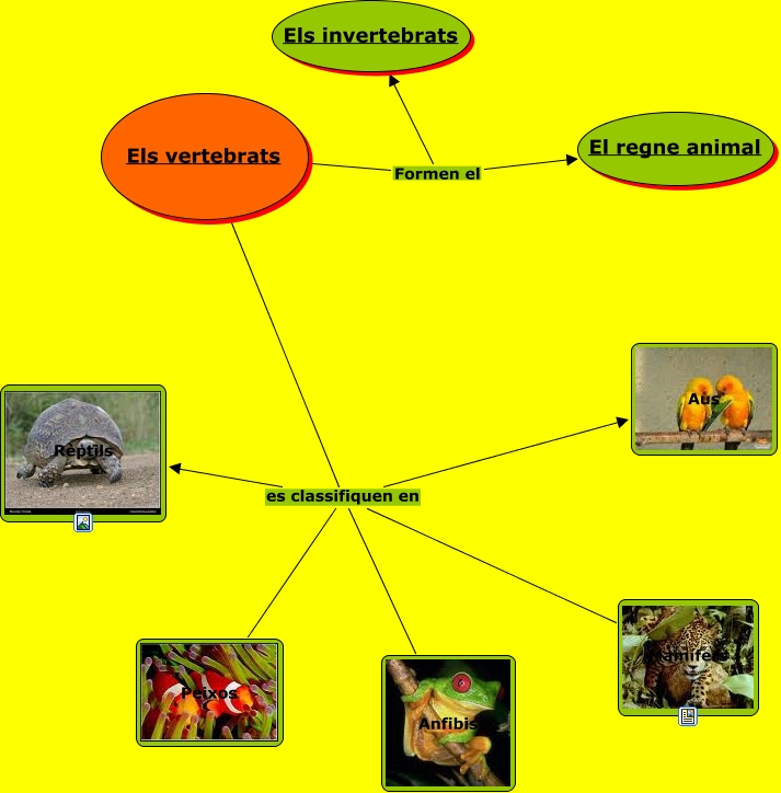 Aquest mapa conceptual conté informació relacionada amb: El vertebratsII, Els vertebrats es classifiquen en Aus, Els vertebrats es classifiquen en Rèptils, Els vertebrats es classifiquen en Anfibis, Els vertebrats Formen el Els invertebrats, Els vertebrats es classifiquen en Peixos, Els vertebrats Formen el El regne animal, Els vertebrats es classifiquen en Mamífers