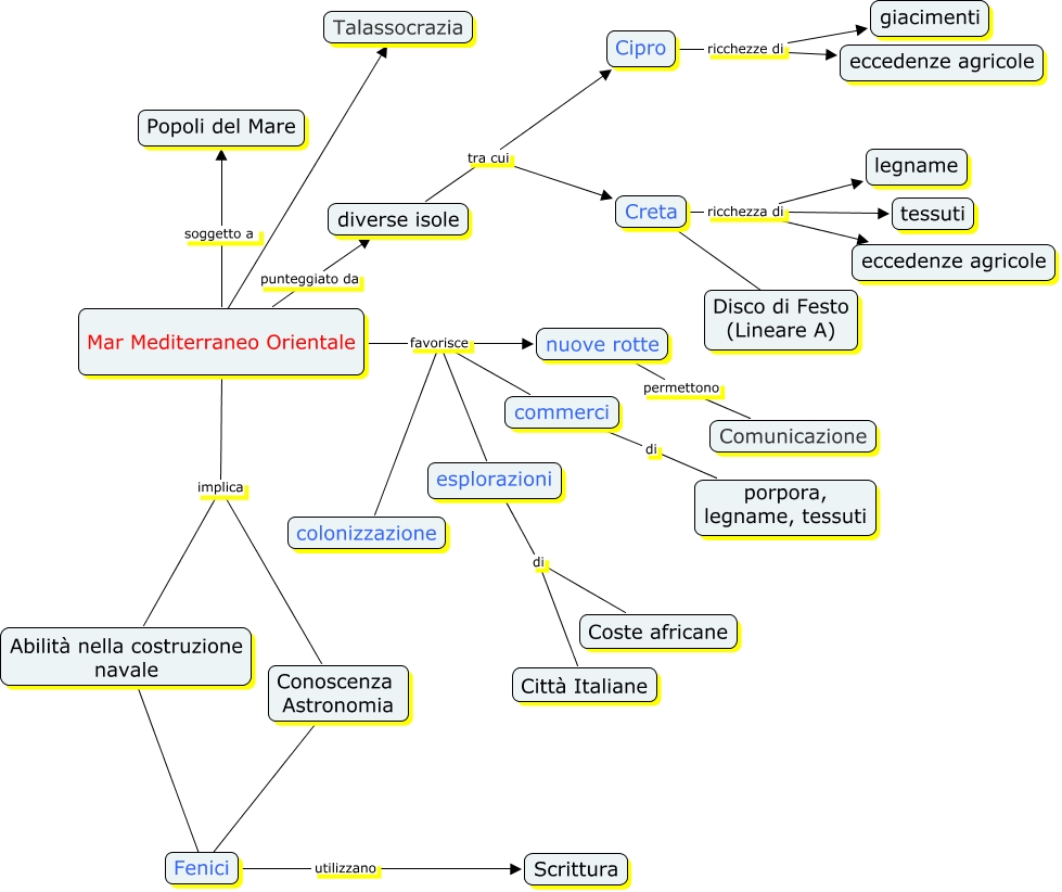 Questa Cmap, creata con IHMC CmapTools, contiene informazioni relative a: Commerci sul Mediterraneo Orientale (Sonzogni), nuove rotte permettono Comunicazione, commerci di porpora, legname, tessuti, esplorazioni di Coste africane, Mar Mediterraneo Orientale favorisce esplorazioni, Creta ricchezza di eccedenze agricole, Creta ricchezza di legname, Mar Mediterraneo Orientale favorisce nuove rotte, Creta ricchezza di tessuti, Mar Mediterraneo Orientale ???? Talassocrazia, Fenici utilizzano Scrittura, diverse isole tra cui Cipro, Cipro ricchezze di giacimenti, Abilità nella costruzione navale ???? Fenici, diverse isole tra cui Creta, esplorazioni di Città Italiane, Mar Mediterraneo Orientale implica Abilità nella costruzione navale, Creta Disco di Festo (Lineare A), Mar Mediterraneo Orientale punteggiato da diverse isole, Mar Mediterraneo Orientale implica Conoscenza Astronomia, Mar Mediterraneo Orientale favorisce colonizzazione