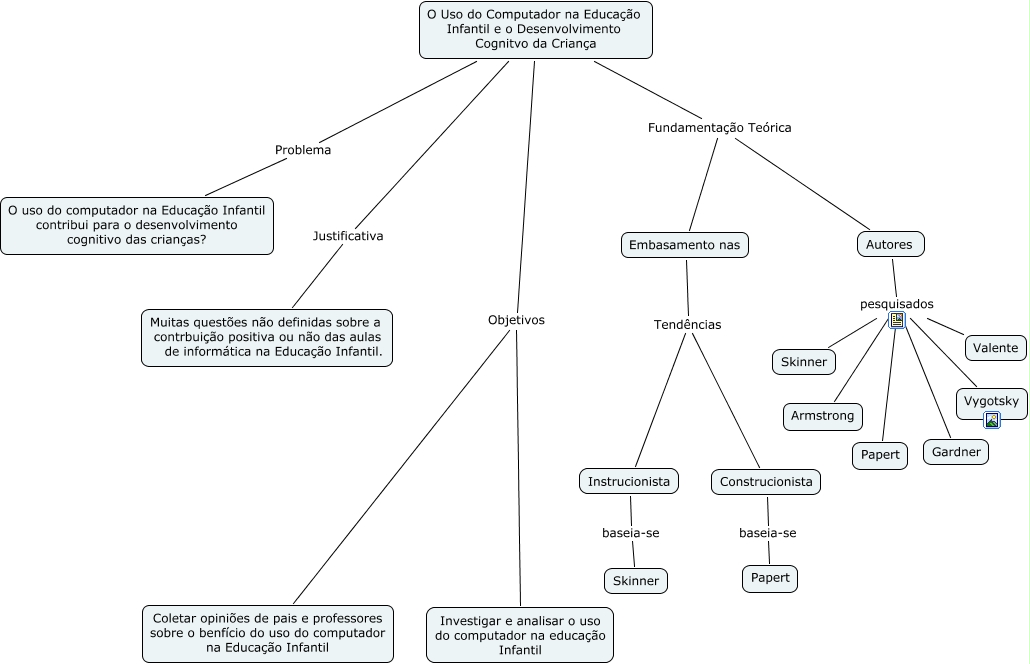 Esse mapa conceitual, produzido no IHMC CmapTools, tem a informação relacionada a: Projeto_Carla_Carvalho, Autores pesquisados Armstrong, Valente pesquisados Armstrong, Construcionista baseia-se Papert, O Uso do Computador na Educação Infantil e o Desenvolvimento Cognitvo da Criança Objetivos Investigar e analisar o uso do computador na educação Infantil, Autores pesquisados Papert, O Uso do Computador na Educação Infantil e o Desenvolvimento Cognitvo da Criança Problema O uso do computador na Educação Infantil contribui para o desenvolvimento cognitivo das crianças?, Autores pesquisados Vygotsky, O Uso do Computador na Educação Infantil e o Desenvolvimento Cognitvo da Criança Fundamentação Teórica Embasamento nas, O Uso do Computador na Educação Infantil e o Desenvolvimento Cognitvo da Criança Justificativa Muitas questões não definidas sobre a contrbuição positiva ou não das aulas de informática na Educação Infantil., Autores Fundamentação Teórica Embasamento nas, Autores pesquisados Skinner, O Uso do Computador na Educação Infantil e o Desenvolvimento Cognitvo da Criança Objetivos Coletar opiniões de pais e professores sobre o benfício do uso do computador na Educação Infantil, Embasamento nas Tendências Construcionista, Valente pesquisados Gardner, Instrucionista baseia-se Skinner, Autores pesquisados Gardner, Valente pesquisados Vygotsky, Embasamento nas Tendências Instrucionista, Valente pesquisados Skinner, Valente pesquisados Papert