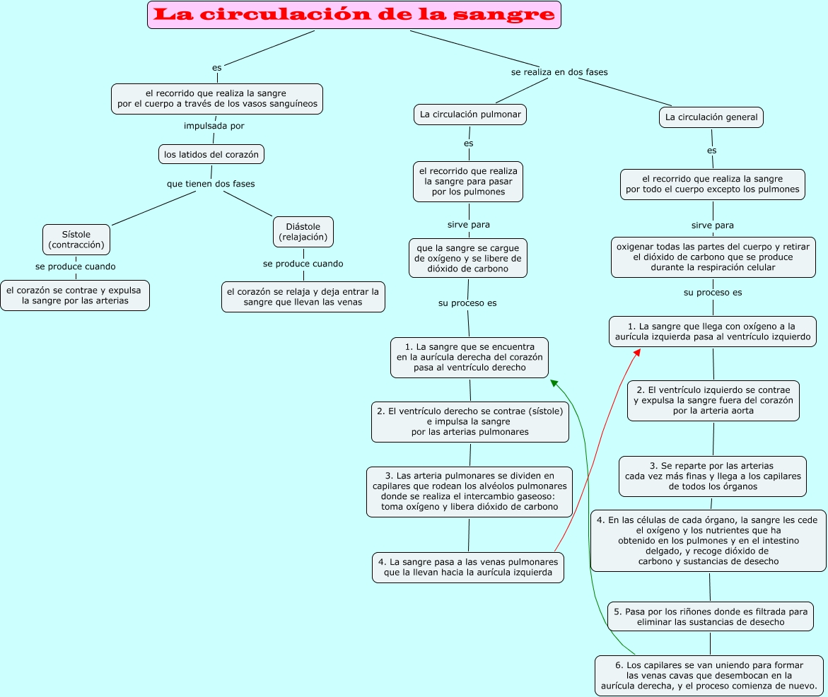 Este Cmap, tiene información relacionada con: La circulación de la sangre, los latidos del corazón que tienen dos fases Sístole (contracción), los latidos del corazón que tienen dos fases Diástole (relajación), 1. La sangre que se encuentra en la aurícula derecha del corazón pasa al ventrículo derecho 2. El ventrículo derecho se contrae (sístole) e impulsa la sangre por las arterias pulmonares, el recorrido que realiza la sangre por todo el cuerpo excepto los pulmones sirve para oxigenar todas las partes del cuerpo y retirar el dióxido de carbono que se produce durante la respiración celular, La circulación pulmonar es el recorrido que realiza la sangre para pasar por los pulmones, La circulación general es el recorrido que realiza la sangre por todo el cuerpo excepto los pulmones, el recorrido que realiza la sangre por el cuerpo a través de los vasos sanguíneos impulsada por los latidos del corazón, el recorrido que realiza la sangre para pasar por los pulmones sirve para que la sangre se cargue de oxígeno y se libere de dióxido de carbono, 4. La sangre pasa a las venas pulmonares que la llevan hacia la aurícula izquierda 1. La sangre que llega con oxígeno a la aurícula izquierda pasa al ventrículo izquierdo, 2. El ventrículo derecho se contrae (sístole) e impulsa la sangre por las arterias pulmonares 3. Las arteria pulmonares se dividen en capilares que rodean los alvéolos pulmonares donde se realiza el intercambio gaseoso: toma oxígeno y libera dióxido de carbono, 4. En las células de cada órgano, la sangre les cede el oxígeno y los nutrientes que ha obtenido en los pulmones y en el intestino delgado, y recoge dióxido de carbono y sustancias de desecho 5. Pasa por los riñones donde es filtrada para eliminar las sustancias de desecho, 6. Los capilares se van uniendo para formar las venas cavas que desembocan en la aurícula derecha, y el proceso comienza de nuevo. 1. La sangre que se encuentra en la aurícula derecha del corazón pasa al ventrículo derecho, La circulación de la sangre se realiza en dos fases La circulación pulmonar, La circulación de la sangre se realiza en dos fases La circulación general, Sístole (contracción) se produce cuando el corazón se contrae y expulsa la sangre por las arterias, oxigenar todas las partes del cuerpo y retirar el dióxido de carbono que se produce durante la respiración celular su proceso es 1. La sangre que llega con oxígeno a la aurícula izquierda pasa al ventrículo izquierdo, 1. La sangre que llega con oxígeno a la aurícula izquierda pasa al ventrículo izquierdo 2. El ventrículo izquierdo se contrae y expulsa la sangre fuera del corazón por la arteria aorta, 3. Las arteria pulmonares se dividen en capilares que rodean los alvéolos pulmonares donde se realiza el intercambio gaseoso: toma oxígeno y libera dióxido de carbono 4. La sangre pasa a las venas pulmonares que la llevan hacia la aurícula izquierda, Diástole (relajación) se produce cuando el corazón se relaja y deja entrar la sangre que llevan las venas, 2. El ventrículo izquierdo se contrae y expulsa la sangre fuera del corazón por la arteria aorta 3. Se reparte por las arterias cada vez más finas y llega a los capilares de todos los órganos