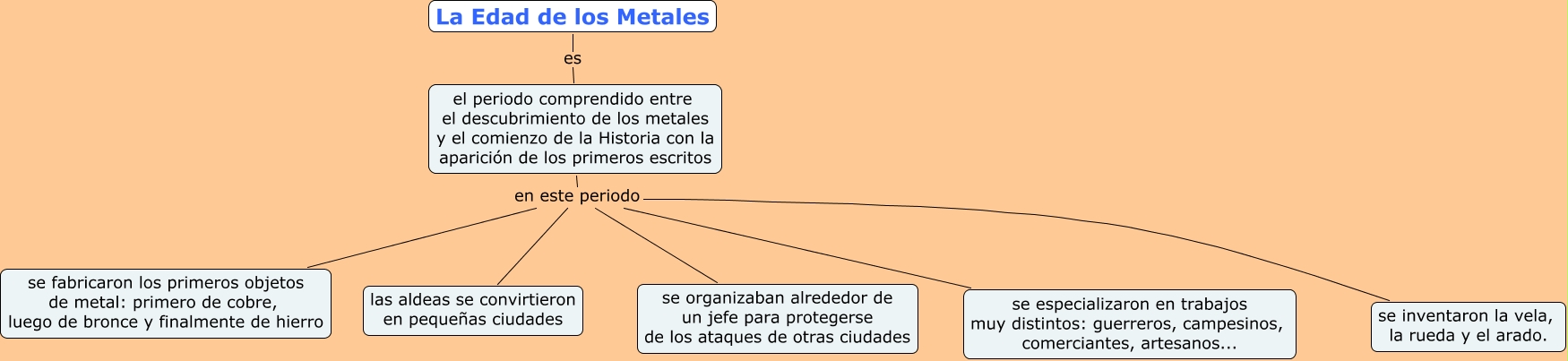 Este Cmap, tiene información relacionada con: La Edad de los Metales, el periodo comprendido entre el descubrimiento de los metales y el comienzo de la Historia con la aparición de los primeros escritos en este periodo se inventaron la vela, la rueda y el arado., el periodo comprendido entre el descubrimiento de los metales y el comienzo de la Historia con la aparición de los primeros escritos en este periodo se fabricaron los primeros objetos de metal: primero de cobre, luego de bronce y finalmente de hierro, el periodo comprendido entre el descubrimiento de los metales y el comienzo de la Historia con la aparición de los primeros escritos en este periodo las aldeas se convirtieron en pequeñas ciudades, La Edad de los Metales es el periodo comprendido entre el descubrimiento de los metales y el comienzo de la Historia con la aparición de los primeros escritos, el periodo comprendido entre el descubrimiento de los metales y el comienzo de la Historia con la aparición de los primeros escritos en este periodo se especializaron en trabajos muy distintos: guerreros, campesinos, comerciantes, artesanos..., el periodo comprendido entre el descubrimiento de los metales y el comienzo de la Historia con la aparición de los primeros escritos en este periodo se organizaban alrededor de un jefe para protegerse de los ataques de otras ciudades