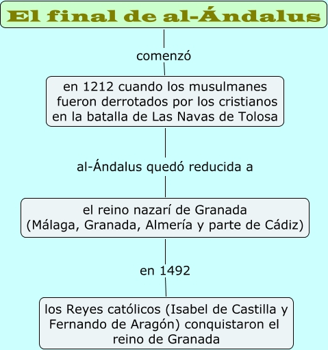 Este Cmap, tiene información relacionada con: El final de al-Ándalus, el reino nazarí de Granada (Málaga, Granada, Almería y parte de Cádiz) en 1492 los Reyes católicos (Isabel de Castilla y Fernando de Aragón) conquistaron el reino de Granada, en 1212 cuando los musulmanes fueron derrotados por los cristianos en la batalla de Las Navas de Tolosa al-Ándalus quedó reducida a el reino nazarí de Granada (Málaga, Granada, Almería y parte de Cádiz), El final de al-Ándalus comenzó en 1212 cuando los musulmanes fueron derrotados por los cristianos en la batalla de Las Navas de Tolosa