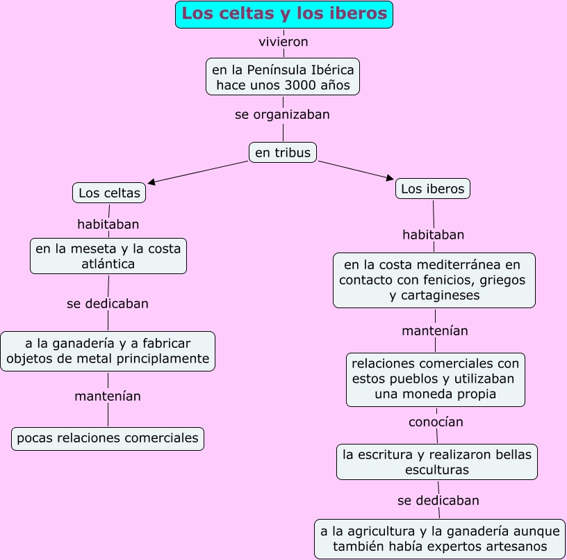 Este Cmap, tiene información relacionada con: Los celtas y los iberos, Los celtas habitaban en la meseta y la costa atlántica, relaciones comerciales con estos pueblos y utilizaban una moneda propia conocían la escritura y realizaron bellas esculturas, la escritura y realizaron bellas esculturas se dedicaban a la agricultura y la ganadería aunque también había expertos artesanos, a la ganadería y a fabricar objetos de metal principlamente mantenían pocas relaciones comerciales, Los celtas y los iberos vivieron en la Península Ibérica hace unos 3000 años, en tribus Los iberos, Los iberos habitaban en la costa mediterránea en contacto con fenicios, griegos y cartagineses, en la meseta y la costa atlántica se dedicaban a la ganadería y a fabricar objetos de metal principlamente, en la Península Ibérica hace unos 3000 años se organizaban en tribus, en tribus Los celtas, en la costa mediterránea en contacto con fenicios, griegos y cartagineses mantenían relaciones comerciales con estos pueblos y utilizaban una moneda propia
