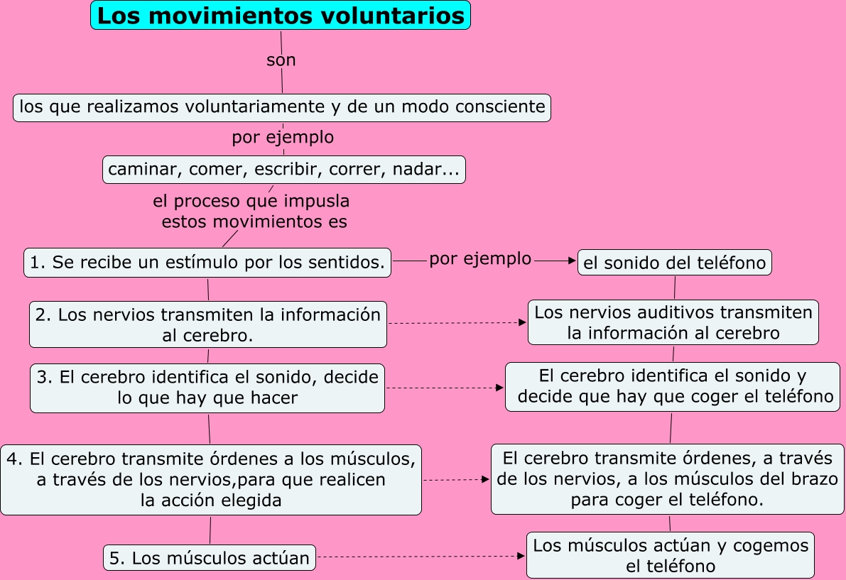 Este Cmap, tiene información relacionada con: Los movimientos voluntarios, 3. El cerebro identifica el sonido, decide lo que hay que hacer 4. El cerebro transmite órdenes a los músculos, a través de los nervios,para que realicen la acción elegida, 1. Se recibe un estímulo por los sentidos. por ejemplo el sonido del teléfono, Los movimientos voluntarios son los que realizamos voluntariamente y de un modo consciente, Los nervios auditivos transmiten la información al cerebro El cerebro identifica el sonido y decide que hay que coger el teléfono, caminar, comer, escribir, correr, nadar... el proceso que impusla estos movimientos es 1. Se recibe un estímulo por los sentidos., 1. Se recibe un estímulo por los sentidos. 2. Los nervios transmiten la información al cerebro., 4. El cerebro transmite órdenes a los músculos, a través de los nervios,para que realicen la acción elegida El cerebro transmite órdenes, a través de los nervios, a los músculos del brazo para coger el teléfono., el sonido del teléfono Los nervios auditivos transmiten la información al cerebro, 3. El cerebro identifica el sonido, decide lo que hay que hacer El cerebro identifica el sonido y decide que hay que coger el teléfono, 2. Los nervios transmiten la información al cerebro. 3. El cerebro identifica el sonido, decide lo que hay que hacer, El cerebro identifica el sonido y decide que hay que coger el teléfono El cerebro transmite órdenes, a través de los nervios, a los músculos del brazo para coger el teléfono., 5. Los músculos actúan Los músculos actúan y cogemos el teléfono, El cerebro transmite órdenes, a través de los nervios, a los músculos del brazo para coger el teléfono. Los músculos actúan y cogemos el teléfono, 2. Los nervios transmiten la información al cerebro. Los nervios auditivos transmiten la información al cerebro, 4. El cerebro transmite órdenes a los músculos, a través de los nervios,para que realicen la acción elegida 5. Los músculos actúan, los que realizamos voluntariamente y de un modo consciente por ejemplo caminar, comer, escribir, correr, nadar...