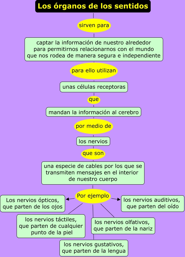 Este Cmap, tiene información relacionada con: Los órganos de los sentidos, unas células receptoras que mandan la información al cerebro, los nervios que son una especie de cables por los que se transmiten mensajes en el interior de nuestro cuerpo, una especie de cables por los que se transmiten mensajes en el interior de nuestro cuerpo Por ejemplo los nervios gustativos, que parten de la lengua, Los órganos de los sentidos sirven para captar la información de nuestro alrededor para permitirnos relacionarnos con el mundo que nos rodea de manera segura e independiente, una especie de cables por los que se transmiten mensajes en el interior de nuestro cuerpo Por ejemplo los nervios auditivos, que parten del oído, una especie de cables por los que se transmiten mensajes en el interior de nuestro cuerpo Por ejemplo los nervios olfativos, que parten de la nariz, captar la información de nuestro alrededor para permitirnos relacionarnos con el mundo que nos rodea de manera segura e independiente para ello utilizan unas células receptoras, una especie de cables por los que se transmiten mensajes en el interior de nuestro cuerpo Por ejemplo Los nervios ópticos, que parten de los ojos, mandan la información al cerebro por medio de los nervios, una especie de cables por los que se transmiten mensajes en el interior de nuestro cuerpo Por ejemplo los nervios táctiles, que parten de cualquier punto de la piel