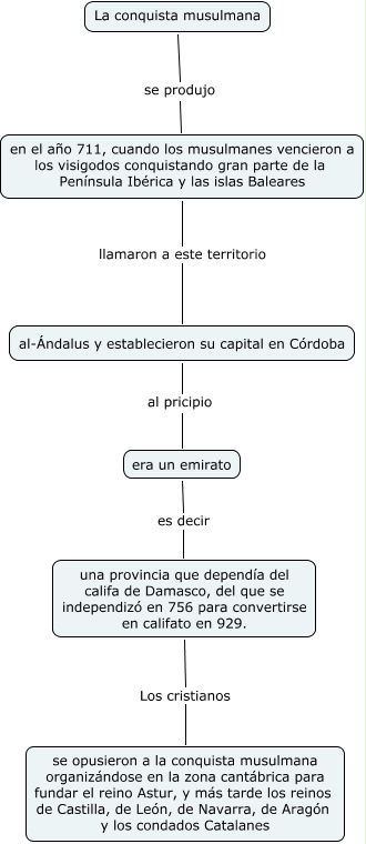 Este Cmap, tiene información relacionada con: La conquista musulmana, en el año 711, cuando los musulmanes vencieron a los visigodos conquistando gran parte de la Península Ibérica y las islas Baleares llamaron a este territorio al-Ándalus y establecieron su capital en Córdoba, La conquista musulmana se produjo en el año 711, cuando los musulmanes vencieron a los visigodos conquistando gran parte de la Península Ibérica y las islas Baleares, al-Ándalus y establecieron su capital en Córdoba al pricipio era un emirato, era un emirato es decir una provincia que dependía del califa de Damasco, del que se independizó en 756 para convertirse en califato en 929., una provincia que dependía del califa de Damasco, del que se independizó en 756 para convertirse en califato en 929. Los cristianos se opusieron a la conquista musulmana organizándose en la zona cantábrica para fundar el reino Astur, y más tarde los reinos de Castilla, de León, de Navarra, de Aragón y los condados Catalanes
