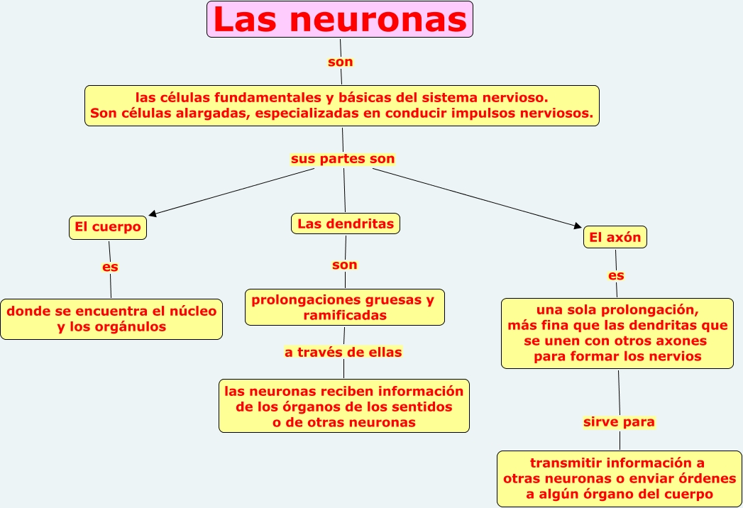 Este Cmap, tiene información relacionada con: Las neuronas, El axón es una sola prolongación, más fina que las dendritas que se unen con otros axones para formar los nervios, las células fundamentales y básicas del sistema nervioso. Son células alargadas, especializadas en conducir impulsos nerviosos. sus partes son El cuerpo, una sola prolongación, más fina que las dendritas que se unen con otros axones para formar los nervios sirve para transmitir información a otras neuronas o enviar órdenes a algún órgano del cuerpo, prolongaciones gruesas y ramificadas a través de ellas las neuronas reciben información de los órganos de los sentidos o de otras neuronas, Las neuronas son las células fundamentales y básicas del sistema nervioso. Son células alargadas, especializadas en conducir impulsos nerviosos., las células fundamentales y básicas del sistema nervioso. Son células alargadas, especializadas en conducir impulsos nerviosos. sus partes son El axón, Las dendritas son prolongaciones gruesas y ramificadas, El cuerpo es donde se encuentra el núcleo y los orgánulos, las células fundamentales y básicas del sistema nervioso. Son células alargadas, especializadas en conducir impulsos nerviosos. sus partes son Las dendritas