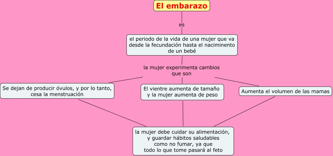 Este Cmap, tiene información relacionada con: El embarazo, el periodo de la vida de una mujer que va desde la fecundación hasta el naciminento de un bebé la mujer experimenta cambios que son Se dejan de producir óvulos, y por lo tanto, cesa la menstruación, El vientre aumenta de tamaño y la mujer aumenta de peso la mujer debe cuidar su alimentación, y guardar hábitos saludables como no fumar, ya que todo lo que tome pasará al feto, el periodo de la vida de una mujer que va desde la fecundación hasta el naciminento de un bebé la mujer experimenta cambios que son Aumenta el volumen de las mamas, El embarazo es el periodo de la vida de una mujer que va desde la fecundación hasta el naciminento de un bebé, Se dejan de producir óvulos, y por lo tanto, cesa la menstruación la mujer debe cuidar su alimentación, y guardar hábitos saludables como no fumar, ya que todo lo que tome pasará al feto, el periodo de la vida de una mujer que va desde la fecundación hasta el naciminento de un bebé la mujer experimenta cambios que son El vientre aumenta de tamaño y la mujer aumenta de peso, Aumenta el volumen de las mamas la mujer debe cuidar su alimentación, y guardar hábitos saludables como no fumar, ya que todo lo que tome pasará al feto