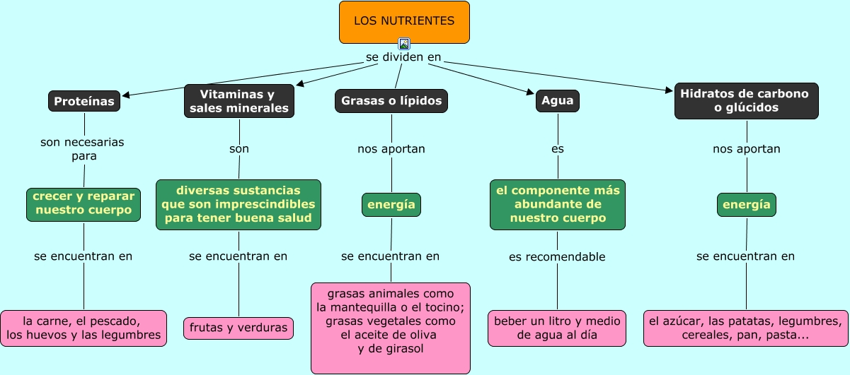 Este Cmap, tiene información relacionada con: Los nutrientes, Proteínas son necesarias para crecer y reparar nuestro cuerpo, energía se encuentran en grasas animales como la mantequilla o el tocino; grasas vegetales como el aceite de oliva y de girasol, diversas sustancias que son imprescindibles para tener buena salud se encuentran en frutas y verduras, LOS NUTRIENTES se dividen en Vitaminas y sales minerales, LOS NUTRIENTES se dividen en Hidratos de carbono o glúcidos, LOS NUTRIENTES se dividen en Agua, Hidratos de carbono o glúcidos nos aportan energía, LOS NUTRIENTES se dividen en Proteínas, el componente más abundante de nuestro cuerpo es recomendable beber un litro y medio de agua al día, crecer y reparar nuestro cuerpo se encuentran en la carne, el pescado, los huevos y las legumbres, LOS NUTRIENTES se dividen en Grasas o lípidos, Vitaminas y sales minerales son diversas sustancias que son imprescindibles para tener buena salud, Grasas o lípidos nos aportan energía, Agua es el componente más abundante de nuestro cuerpo, energía se encuentran en el azúcar, las patatas, legumbres, cereales, pan, pasta...