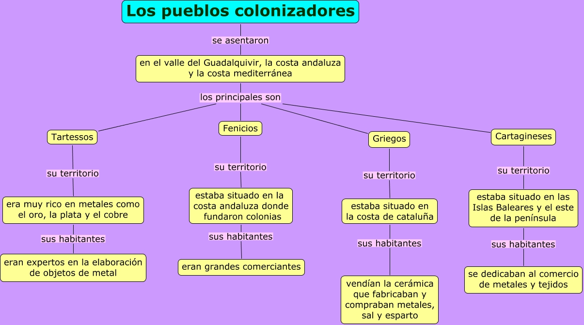 Este Cmap, tiene información relacionada con: Los pueblos colonizadores, Tartessos su territorio era muy rico en metales como el oro, la plata y el cobre, estaba situado en la costa andaluza donde fundaron colonias sus habitantes eran grandes comerciantes, en el valle del Guadalquivir, la costa andaluza y la costa mediterránea los principales son Fenicios, Los pueblos colonizadores se asentaron en el valle del Guadalquivir, la costa andaluza y la costa mediterránea, Fenicios su territorio estaba situado en la costa andaluza donde fundaron colonias, en el valle del Guadalquivir, la costa andaluza y la costa mediterránea los principales son Griegos, Griegos su territorio estaba situado en la costa de cataluña, Cartagineses su territorio estaba situado en las Islas Baleares y el este de la península, estaba situado en las Islas Baleares y el este de la península sus habitantes se dedicaban al comercio de metales y tejidos, estaba situado en la costa de cataluña sus habitantes vendían la cerámica que fabricaban y compraban metales, sal y esparto, era muy rico en metales como el oro, la plata y el cobre sus habitantes eran expertos en la elaboración de objetos de metal, en el valle del Guadalquivir, la costa andaluza y la costa mediterránea los principales son Tartessos, en el valle del Guadalquivir, la costa andaluza y la costa mediterránea los principales son Cartagineses