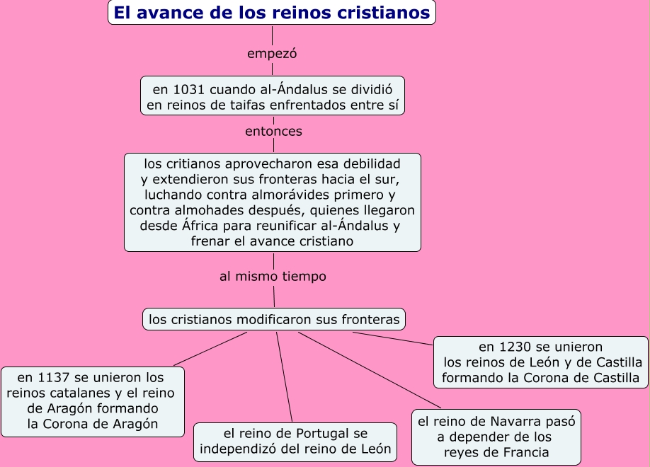 Este Cmap, tiene información relacionada con: El avance de los reinos cristianos, los cristianos modificaron sus fronteras en 1137 se unieron los reinos catalanes y el reino de Aragón formando la Corona de Aragón, El avance de los reinos cristianos empezó en 1031 cuando al-Ándalus se dividió en reinos de taifas enfrentados entre sí, los cristianos modificaron sus fronteras el reino de Navarra pasó a depender de los reyes de Francia, los cristianos modificaron sus fronteras el reino de Portugal se independizó del reino de León, los cristianos modificaron sus fronteras en 1230 se unieron los reinos de León y de Castilla formando la Corona de Castilla, los critianos aprovecharon esa debilidad y extendieron sus fronteras hacia el sur, luchando contra almorávides primero y contra almohades después, quienes llegaron desde África para reunificar al-Ándalus y frenar el avance cristiano al mismo tiempo los cristianos modificaron sus fronteras, en 1031 cuando al-Ándalus se dividió en reinos de taifas enfrentados entre sí entonces los critianos aprovecharon esa debilidad y extendieron sus fronteras hacia el sur, luchando contra almorávides primero y contra almohades después, quienes llegaron desde África para reunificar al-Ándalus y frenar el avance cristiano