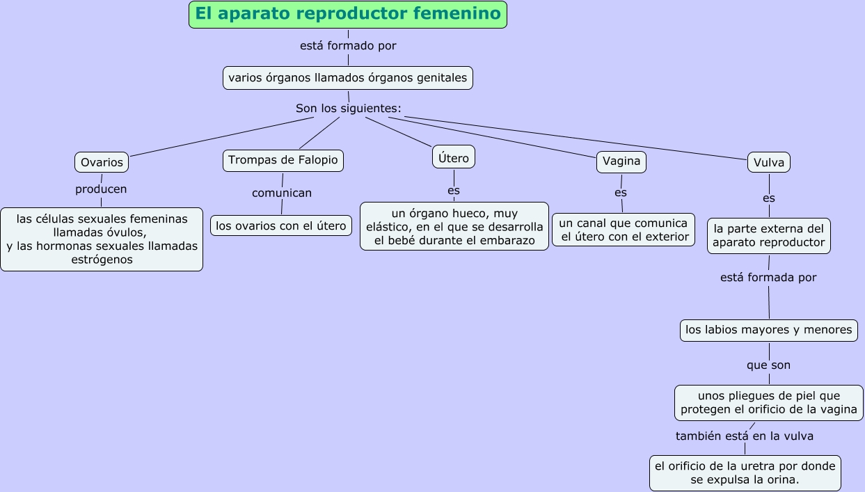 Este Cmap, tiene información relacionada con: El aparato reproductor femenino, El aparato reproductor femenino está formado por varios órganos llamados órganos genitales, Ovarios producen las células sexuales femeninas llamadas óvulos, y las hormonas sexuales llamadas estrógenos, varios órganos llamados órganos genitales Son los siguientes: Útero, Vagina es un canal que comunica el útero con el exterior, varios órganos llamados órganos genitales Son los siguientes: Ovarios, los labios mayores y menores que son unos pliegues de piel que protegen el orificio de la vagina, Útero es un órgano hueco, muy elástico, en el que se desarrolla el bebé durante el embarazo, unos pliegues de piel que protegen el orificio de la vagina también está en la vulva el orificio de la uretra por donde se expulsa la orina., varios órganos llamados órganos genitales Son los siguientes: Vagina, la parte externa del aparato reproductor está formada por los labios mayores y menores, varios órganos llamados órganos genitales Son los siguientes: Trompas de Falopio, Trompas de Falopio comunican los ovarios con el útero, Vulva es la parte externa del aparato reproductor, varios órganos llamados órganos genitales Son los siguientes: Vulva