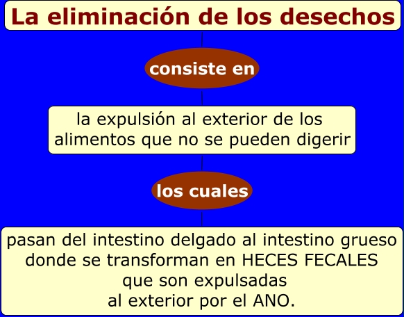 Este Cmap, tiene información relacionada con: La eliminación de los desechos, la expulsión al exterior de los alimentos que no se pueden digerir los cuales pasan del intestino delgado al intestino grueso donde se transforman en HECES FECALES que son expulsadas al exterior por el ANO., La eliminación de los desechos consiste en la expulsión al exterior de los alimentos que no se pueden digerir