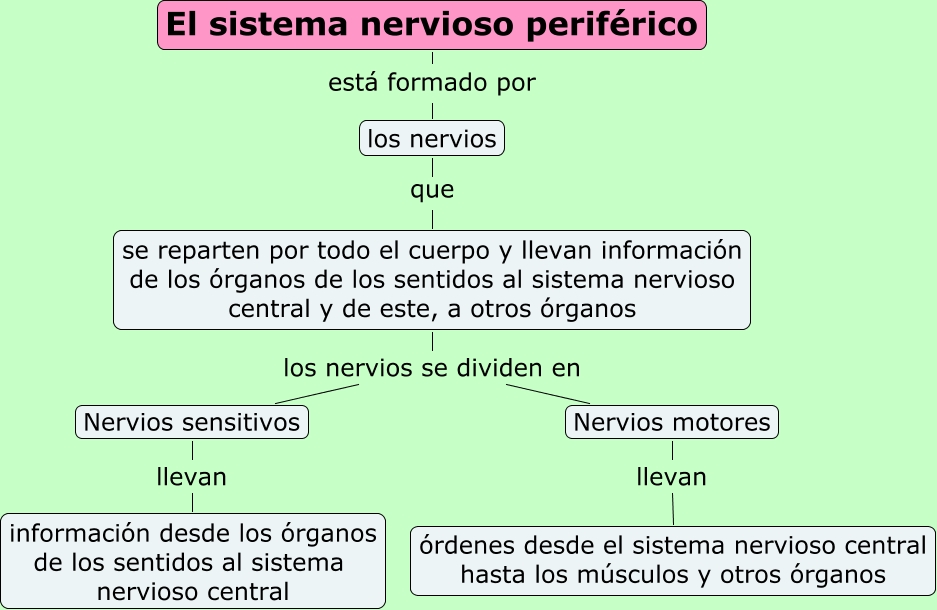 Este Cmap, tiene información relacionada con: El sistema nervioso periférico, se reparten por todo el cuerpo y llevan información de los órganos de los sentidos al sistema nervioso central y de este, a otros órganos los nervios se dividen en Nervios sensitivos, Nervios motores llevan órdenes desde el sistema nervioso central hasta los músculos y otros órganos, Nervios sensitivos llevan información desde los órganos de los sentidos al sistema nervioso central, los nervios que se reparten por todo el cuerpo y llevan información de los órganos de los sentidos al sistema nervioso central y de este, a otros órganos, se reparten por todo el cuerpo y llevan información de los órganos de los sentidos al sistema nervioso central y de este, a otros órganos los nervios se dividen en Nervios motores, El sistema nervioso periférico está formado por los nervios