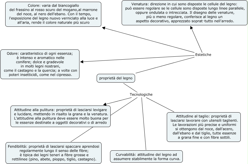 Questa Cmap, creata con IHMC CmapTools, contiene informazioni relative a: ciao, proprietà del legno Tecnologiche Curvabilità: attitudine del legno ad assumere stabilmente la forma curva., proprietà del legno Tecnologiche Attitudine al taglio: proprietà di lasciarsi lavorare con utensili taglienti. Le lavorazioni più precise e uniformi si ottengono dal noce, dall'acero, dall'ebano e dal tiglio, tutte essenze a grana fine e con fibre sottili., proprietà del legno Tecnologiche Attitudine alla pulitura: proprietà di lasciarsi levigare e lucidare, mettendo in risalto la grana e la venatura. L'attitudine alla pulitura deve essere molto buona per le essenze destinate a oggetti decorativi o di arredo, proprietà del legno Tecnologiche Fendibilità: proprietà di lasciarsi spaccare aprendosi regolarmente lungo il senso delle fibre; è tipica dei legni teneri a fibre grosse e rettilinee (pino, abete, pioppo, tiglio, castagno)., proprietà del legno Estetiche Colore: varia dal biancogiallo del frassino al rosso scuro del mogano,al marrone del noce, al nero dell'ebano. Con il tempo, l'esposizione del legno nuovo verniciato alla luce e all'aria, rende il colore naturale più scuro, proprietà del legno Estetiche Odore: caratteristico di ogni essenza; è intenso e aromatico nelle conifere; dolce e gradevole in molti legni nostrani, come il castagno e la quercia; a volte con poteri insetticidi, come nel cipresso., proprietà del legno Estetiche Venatura: direzione in cui sono disposte le cellule del legno: può essere regolare se le cellule sono disposte lungo linee parallele, oppure ondulata o intrecciata. Il disegno delle venature, più o meno regolare, conferisce al legno un aspetto decorativo, apprezzato soprat¬tutto nell'arredo.