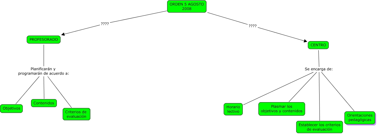 Este Cmap, tiene información relacionada con: ORDEN 5 AGOSTO 2008, PROFESORADO Planificarán y programarán de acuerdo a: Contenidos, PROFESORADO Planificarán y programarán de acuerdo a: Criterios de evaluación, ORDEN 5 AGOSTO 2008 ???? PROFESORADO, CENTRO Se encarga de: Establecer los criterios de evaluación, PROFESORADO Planificarán y programarán de acuerdo a: Objetivos, CENTRO Se encarga de: Plasmar los objetivos y contenidos, CENTRO Se encarga de: Horario lectivo, ORDEN 5 AGOSTO 2008 ???? CENTRO, CENTRO Se encarga de: Orientaciones pedagógicas