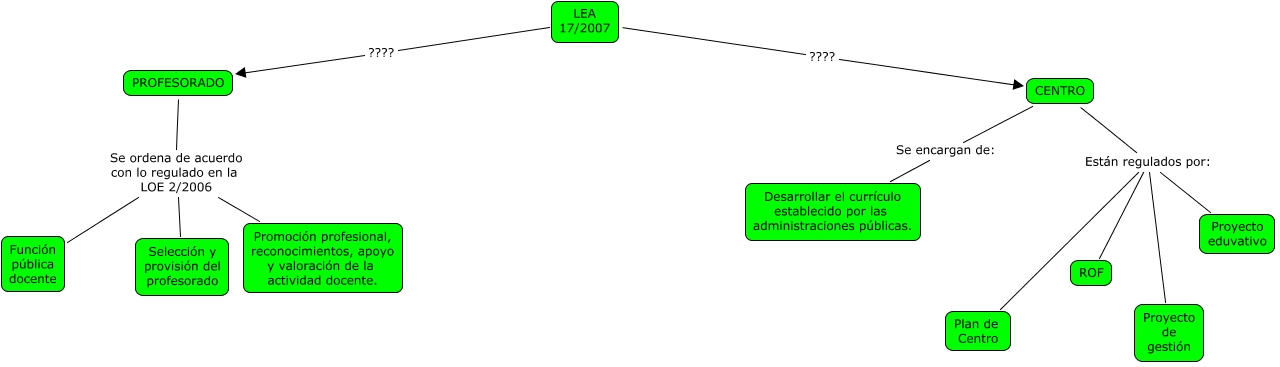 Este Cmap, tiene información relacionada con: LEA 17_2007, CENTRO Están regulados por: ROF, PROFESORADO Se ordena de acuerdo con lo regulado en la LOE 2/2006 Promoción profesional, reconocimientos, apoyo y valoración de la actividad docente., PROFESORADO Se ordena de acuerdo con lo regulado en la LOE 2/2006 Función pública docente, PROFESORADO Se ordena de acuerdo con lo regulado en la LOE 2/2006 Selección y provisión del profesorado, LEA 17/2007 ???? PROFESORADO, CENTRO Se encargan de: Desarrollar el currículo establecido por las administraciones públicas., LEA 17/2007 ???? CENTRO, CENTRO Están regulados por: Proyecto eduvativo, CENTRO Están regulados por: Plan de Centro, CENTRO Están regulados por: Proyecto de gestión