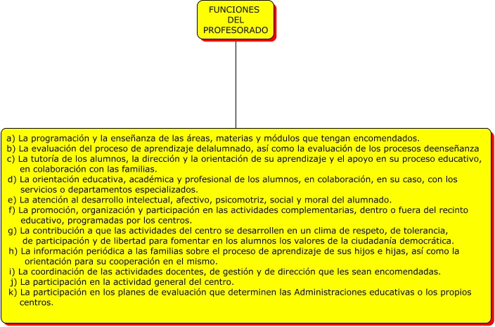 Este Cmap, tiene información relacionada con: FUNCIONES PROFESORADO, FUNCIONES DEL PROFESORADO ???? a) La programación y la enseñanza de las áreas, materias y módulos que tengan encomendados. b) La evaluación del proceso de aprendizaje delalumnado, así como la evaluación de los procesos deenseñanza c) La tutoría de los alumnos, la dirección y la orientación de su aprendizaje y el apoyo en su proceso educativo, en colaboración con las familias. d) La orientación educativa, académica y profesional de los alumnos, en colaboración, en su caso, con los servicios o departamentos especializados. e) La atención al desarrollo intelectual, afectivo, psicomotriz, social y moral del alumnado. f) La promoción, organización y participación en las actividades complementarias, dentro o fuera del recinto educativo, programadas por los centros. g) La contribución a que las actividades del centro se desarrollen en un clima de respeto, de tolerancia, de participación y de libertad para fomentar en los alumnos los valores de la ciudadanía democrática. h) La información periódica a las familias sobre el proceso de aprendizaje de sus hijos e hijas, así como la orientación para su cooperación en el mismo. i) La coordinación de las actividades docentes, de gestión y de dirección que les sean encomendadas. j) La participación en la actividad general del centro. k) La participación en los planes de evaluación que determinen las Administraciones educativas o los propios centros.