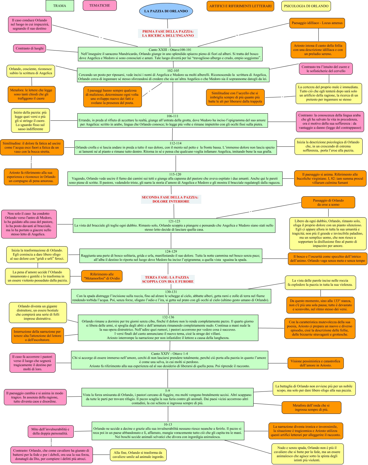 Questa Cmap, creata con IHMC CmapTools, contiene informazioni relative a: Pazzia di Orlando_Marvin Basile, 132-136 Orlando rimane a dormire per tre giorni senza cibo, finché il dolore non lo rende completamente pazzo. Il quarto giorno si libera delle armi, si spoglia degli abiti e dell’armatura rimanendo completamente nudo. Continua a mani nude la la sua opera distruttrice. Nell’udire quei rumori, i pastori accorrono per vedere cosa è successo. I versi finali del canto annunciano il nuovo tema, cioè la strage dei villani. Ariosto interrompe la narrazione per non infastidire il lettore a causa della lunghezza. ???? Interruzione della narrazione per tenere alta l'attenzione del lettore o dell'ascoltatore., 132-136 Orlando rimane a dormire per tre giorni senza cibo, finché il dolore non lo rende completamente pazzo. Il quarto giorno si libera delle armi, si spoglia degli abiti e dell’armatura rimanendo completamente nudo. Continua a mani nude la la sua opera distruttrice. Nell’udire quei rumori, i pastori accorrono per vedere cosa è successo. I versi finali del canto annunciano il nuovo tema, cioè la strage dei villani. Ariosto interrompe la narrazione per non infastidire il lettore a causa della lunghezza. ???? Con la caratteristica mutevolezza della sua poesia, Ariosto ci prepara un nuovo e diverso episodio, cioè la descrizione delle follie, delle bizzarrie stravaganti e grottesche., 124-129 Raggiunta una parte di bosco solitaria, grida e urla, manifestando il suo dolore. Tutta la notte cammina nel bosco senza pace; all’alba il destino lo riporta nel luogo dove Medoro ha inciso l’epigramma; a quella vista sguaina la spada. ???? Inizia la trasformazione di Orlando. Egli comincia a dare libero sfogo al suo dolore con “gridi e urli” feroci., Similitudine: il dolore fa fatica ad uscire come l’acqua esce fuori a fatica da un vaso con la bocca stretta. . Ariosto fa riferimento alla sua esperienza e riconosce in Orlando un compagno di pena amorosa., 112-114 Orlando crolla e si lascia andare in preda a tutto il suo dolore, con il mento sul petto e la fronte bassa. L’immenso dolore non lascia spazio ai lamenti né al pianto e rimane tutto dentro. Ritorna in sé e pensa che qualcuno voglia infamare Angelica, imitando bene la sua grafia. ???? Inizia la descrizione psicologica di Orlando che, in un crescendo di estrema sofferenza, porta l’eroe alla pazzia., Canto XXIII - Ottave100-101 Nell’inseguire il saraceno Mandricardo, Orlando giunge in uno splendido spiazzo pieno di fiori ed alberi. Si tratta del bosco dove Angelica e Medoro si sono conosciuti e amati. Tale luogo diverrà per lui “travaglioso albergo e crudo, empio soggiorno”. . Il caso conduce Orlando nel luogo in cui impazzirà, segnando il suo destino, La certezza del proprio male è immediata. Tutto ciò che egli tenterà dopo sarà solo un artificio della ragione, la ricerca di un pretesto per ingannare se stesso . Similitudine con l’uccello che si imbriglia sempre di più quanto più batte le ali per liberarsi dalla trappola, 106-111 Errando, in preda al rifiuto di accettare la realtà, giunge all’entrata della grotta, dove Medoro ha inciso l’epigramma del suo amore per Angelica: scritto in arabo, lingua che Orlando conosce; lo legge più volte e rimane impietrito con gli occhi fissi sulla pietra. ???? 112-114 Orlando crolla e si lascia andare in preda a tutto il suo dolore, con il mento sul petto e la fronte bassa. L’immenso dolore non lascia spazio ai lamenti né al pianto e rimane tutto dentro. Ritorna in sé e pensa che qualcuno voglia infamare Angelica, imitando bene la sua grafia., 112-114 Orlando crolla e si lascia andare in preda a tutto il suo dolore, con il mento sul petto e la fronte bassa. L’immenso dolore non lascia spazio ai lamenti né al pianto e rimane tutto dentro. Ritorna in sé e pensa che qualcuno voglia infamare Angelica, imitando bene la sua grafia. ???? 115-120 Vagando, Orlando vede uscire il fumo dai camini sui tetti e giunge alla capanna del pastore che aveva ospitato i due amanti. Anche qui le pareti sono piene di scritte. Il pastore, vedendolo triste, gli narra la storia d’amore di Angelica e Medoro e gli mostra il bracciale regalatogli dalla ragazza., 124-129 Raggiunta una parte di bosco solitaria, grida e urla, manifestando il suo dolore. Tutta la notte cammina nel bosco senza pace; all’alba il destino lo riporta nel luogo dove Medoro ha inciso l’epigramma; a quella vista sguaina la spada. ???? TERZA FASE: LA PAZZIA SCOPPIA CON IRA E FURORE, 132-136 Orlando rimane a dormire per tre giorni senza cibo, finché il dolore non lo rende completamente pazzo. Il quarto giorno si libera delle armi, si spoglia degli abiti e dell’armatura rimanendo completamente nudo. Continua a mani nude la la sua opera distruttrice. Nell’udire quei rumori, i pastori accorrono per vedere cosa è successo. I versi finali del canto annunciano il nuovo tema, cioè la strage dei villani. Ariosto interrompe la narrazione per non infastidire il lettore a causa della lunghezza. ???? Canto XXIV - Ottave 1-4 Chi si accorge di essere immerso nell’amore, cerchi di non lasciarsi prendere totalmente, perché ciò porta alla pazzia in quanto l’amore è come una selva, in cui molti si perdono. Ariosto fa riferimento alla sua esperienza ed al suo desiderio di liberarsi di quella pena. Poi riprende il racconto., Canto XXIV - Ottave 1-4 Chi si accorge di essere immerso nell’amore, cerchi di non lasciarsi prendere totalmente, perché ciò porta alla pazzia in quanto l’amore è come una selva, in cui molti si perdono. Ariosto fa riferimento alla sua esperienza ed al suo desiderio di liberarsi di quella pena. Poi riprende il racconto. ???? 5-9 Vista la forza smisurata di Orlando, i pastori cercano di fuggire, ma molti vengono brutalmente uccisi. Altri scappano da tutte le parti per trovare rifugio. Il pazzo scaglia la sua furia contro gli animali. Dai paesi vicini accorrono altri contadini, la 