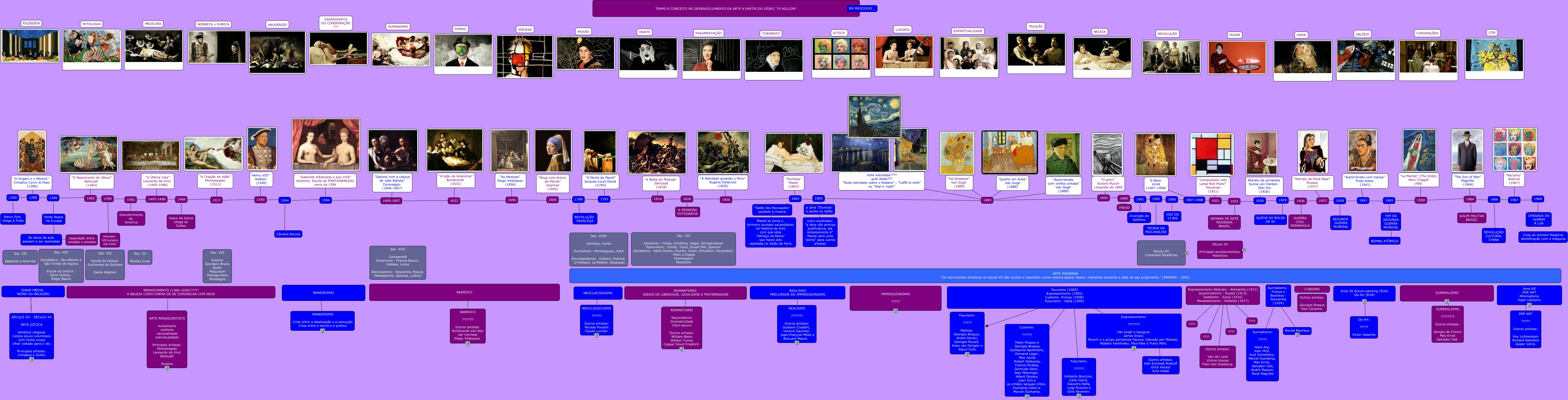 Esse mapa conceitual, produzido no IHMC CmapTools, tem a informação relacionada a: Tempo e Conceito no desenvolvimento da Arte a partir do vídeo 70 million, Expressionismo Abstrato - Alemanha (1911) Suprematismo - Russia (1913) Dadaísmo - Suiça (1916) Neoplasticismo - Holanda (1917) ???? Outros artistas: Van der Leck Vilmos Huszar Theo Van Doesburg, 1865 ???? 1889, BARROCO ???? BARROCO ??????? Outros artistas: Rembrandt Van Rijn Jan Vermeer Diego Velázquez, Fauvismo (1905) Expressionismo (1905) Cubismo -França (1908) Futurismo - Itália (1909) ???? Futurismo: ?????? Umberto Boccioni, Carlo Carrá, Giacomo Balla, Luigi Russolo e Gino Severeni, As obras de arte passam a ser assinadas ???? separação entre aresãos e artistas, 1594 ???? "Gabrielle d’Estréess e sua irmã" Anónimo, Escola de FONTAINEBLEAU cerca de 1594, 1300 ???? 1483, RENASCIMENTO (1300-1650)????? A BELEZA COMO FORMA DE SE COMUNICAR COM DEUS ???? ARTE RENASCENTISTA humanismo realismo racionalidade individualidade Principais artistas: Michelangelo Leonardo da Vinci Botticelli Rubens, 1490 ???? 1492, 1632 ???? 1656, 1907-1908 ???? O Beijo Klimt (1907-1908), 1936 ???? GUERRA CIVIL ESPANHOLA, 1889 ???? 1895, 1906 ???? VOO DO 14 BIS, 1789 ???? REVOLUÇÃO FRANCESA, FIM DA SEGUNDA GUERRA MUNDIAL ???? BOMBA ATÔMICA, Surrealismo - França e Bauhaus - Alemanha (1924) ???? Surrealismo: ????? Hans Arp, Joan Miró, Kurt Schwitters, Marcel Duchamp, Max Ernst, Salvador Dali, André Masson, René Magritte, 1540 ???? 1544, 1498 ???? Vasco da Gama chega às Índias, 1863 ???? 1865