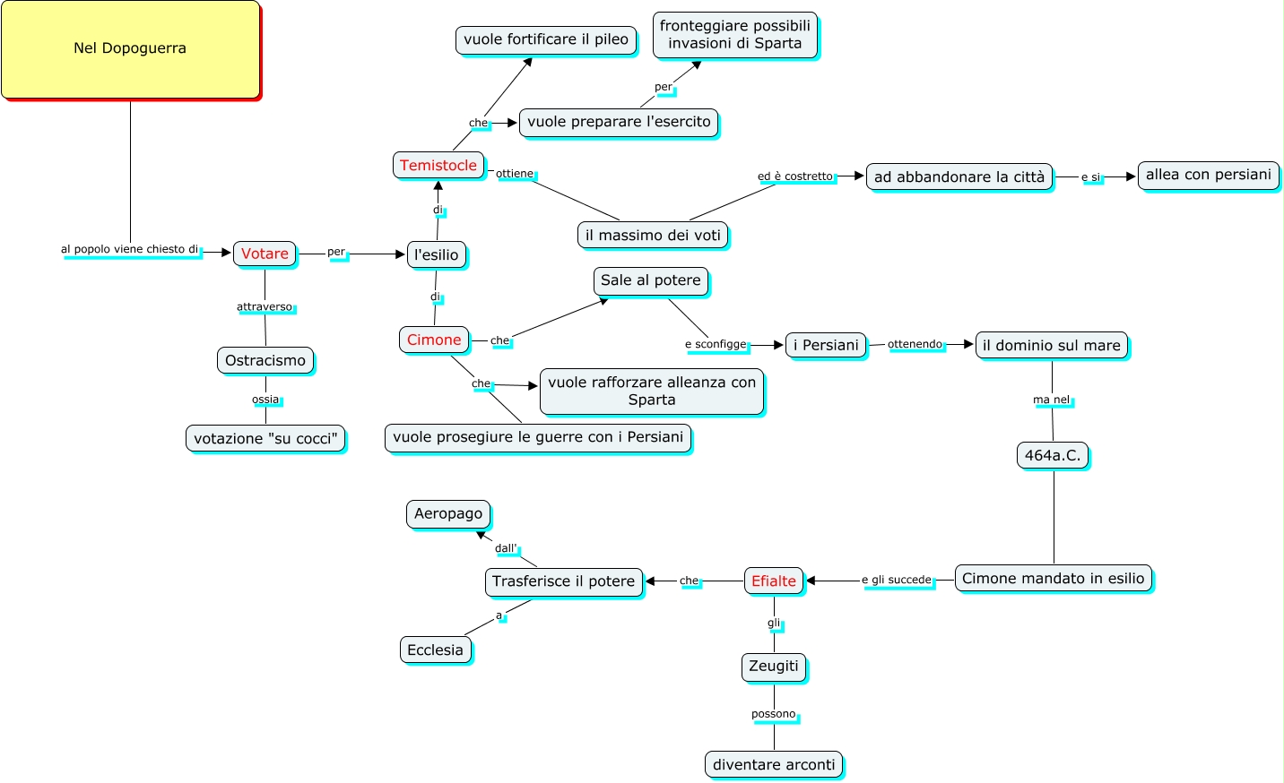 Questa Cmap, creata con IHMC CmapTools, contiene informazioni relative a: Il Dopoguerra - Parte IV (Sonzogni), Votare attraverso Ostracismo, Trasferisce il potere dall' Aeropago, Cimone che Sale al potere, Cimone che vuole prosegiure le guerre con i Persiani, i Persiani ottenendo il dominio sul mare, 464a.C. Cimone mandato in esilio, il dominio sul mare ma nel 464a.C., Sale al potere e sconfigge i Persiani, Ostracismo ossia votazione "su cocci", Nel Dopoguerra al popolo viene chiesto di Votare, vuole preparare l'esercito per fronteggiare possibili invasioni di Sparta, Temistocle che vuole fortificare il pileo, Zeugiti possono diventare arconti, ad abbandonare la città e si allea con persiani, il massimo dei voti ed è costretto ad abbandonare la città, Efialte che Trasferisce il potere, Cimone che vuole rafforzare alleanza con Sparta, Efialte gli Zeugiti, Votare per l'esilio, Temistocle che vuole preparare l'esercito